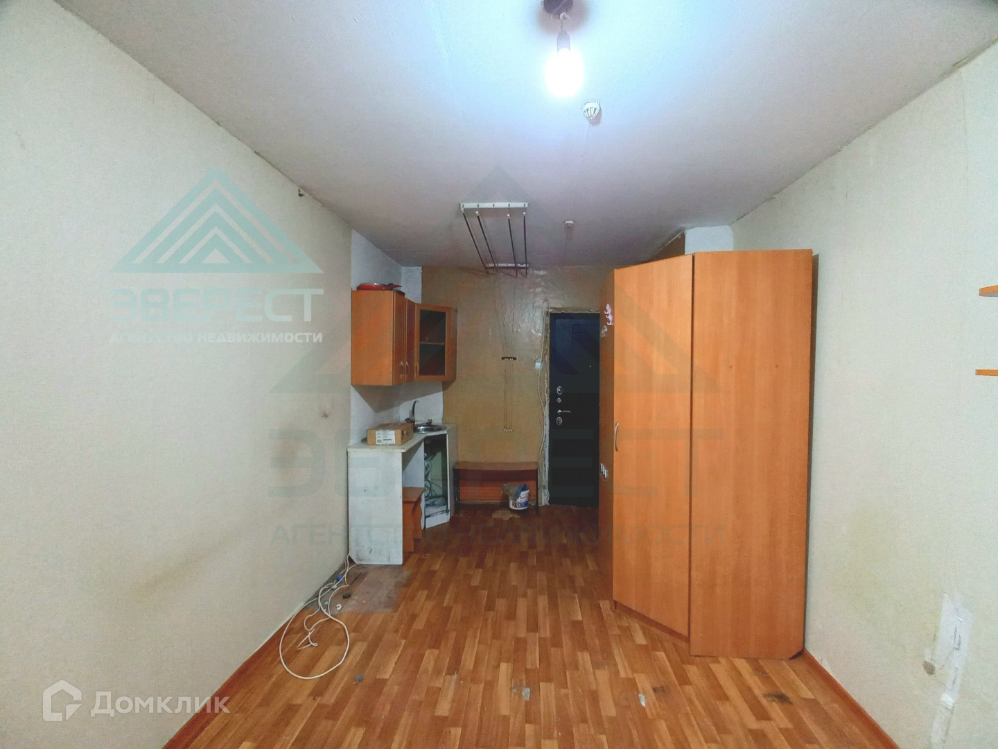 В комнате остается небольшой кухонный гарнитур и шкаф. Есть бельевая сушилка.