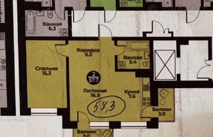 Общая площадь 57.5 м2