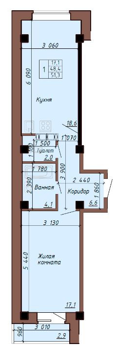 Общая площадь 51.3 м2