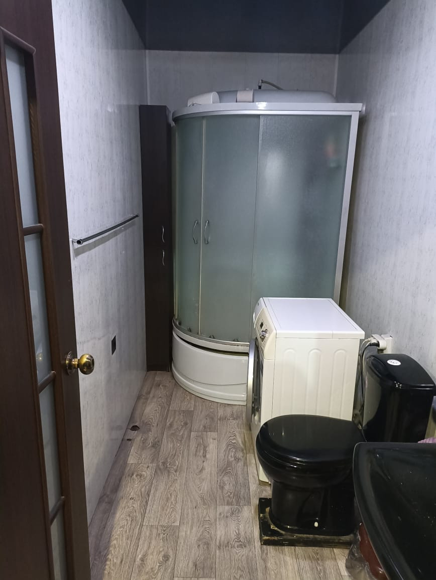 Санузел с большой душевой кабиной и современным санфаянсом