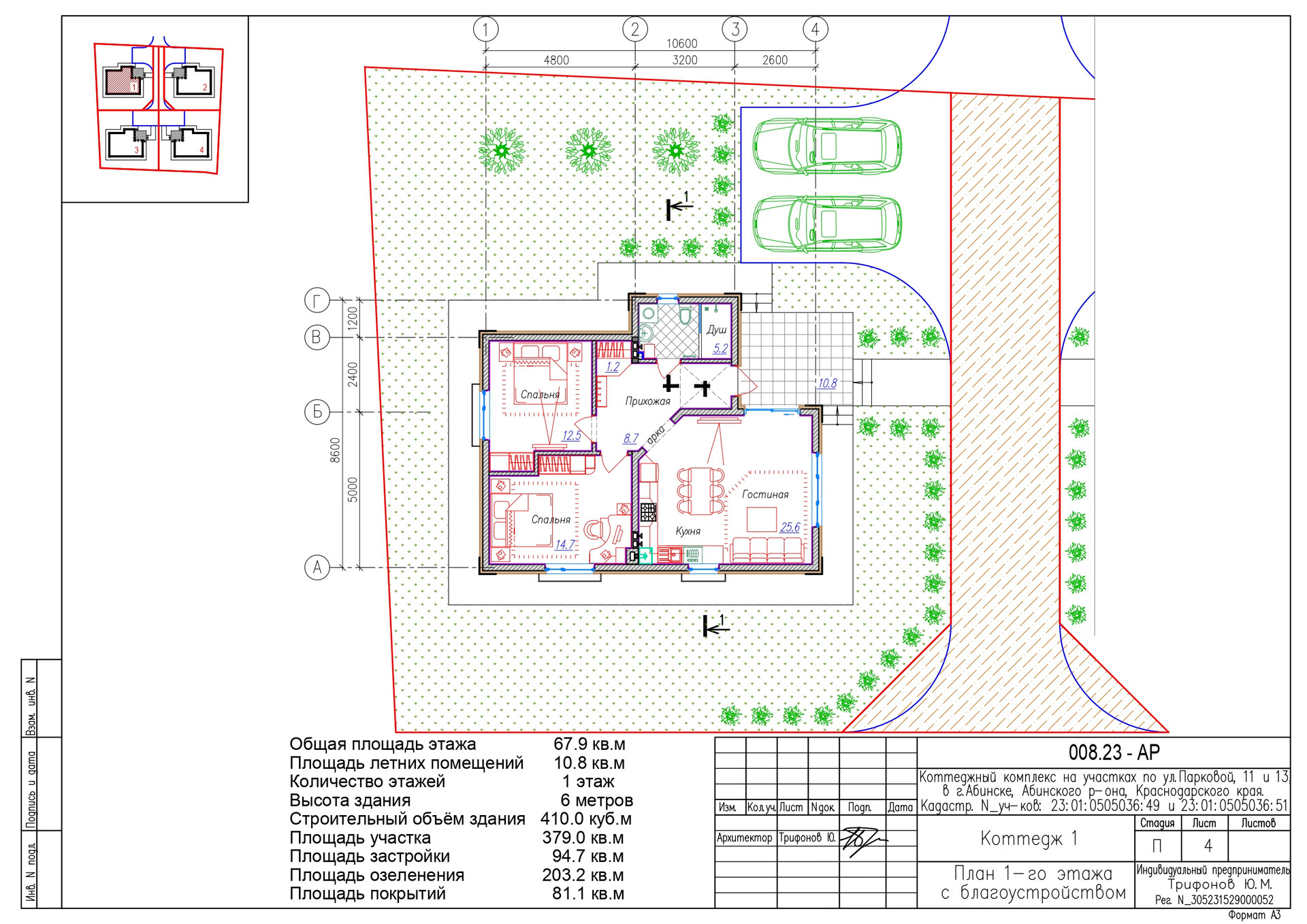 Состоит из4 одноэтажных домов площадью 67,9м2