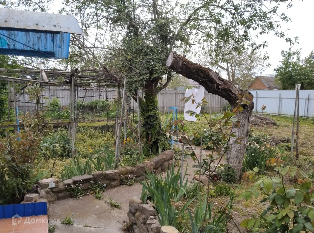 Угловой участок, ухоженный огород, растут плодовые деревья.
