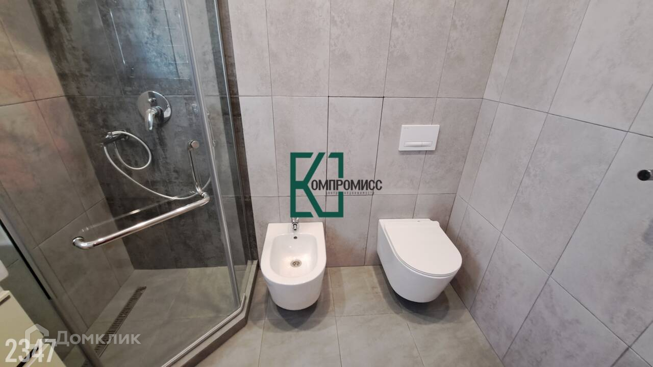 санузле установлена душевая кабина, биде, унитаз, раковина с тумбой и зеркало с