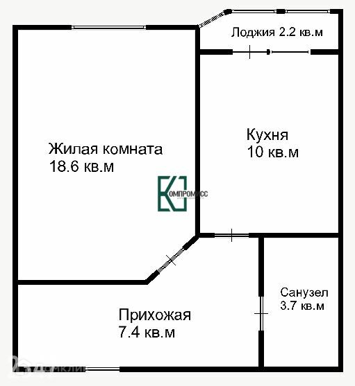 Площадь жилой комнаты 18.6 кв.м, кухни 10 кв.м, санузла 3.7 кв.м, прихожей