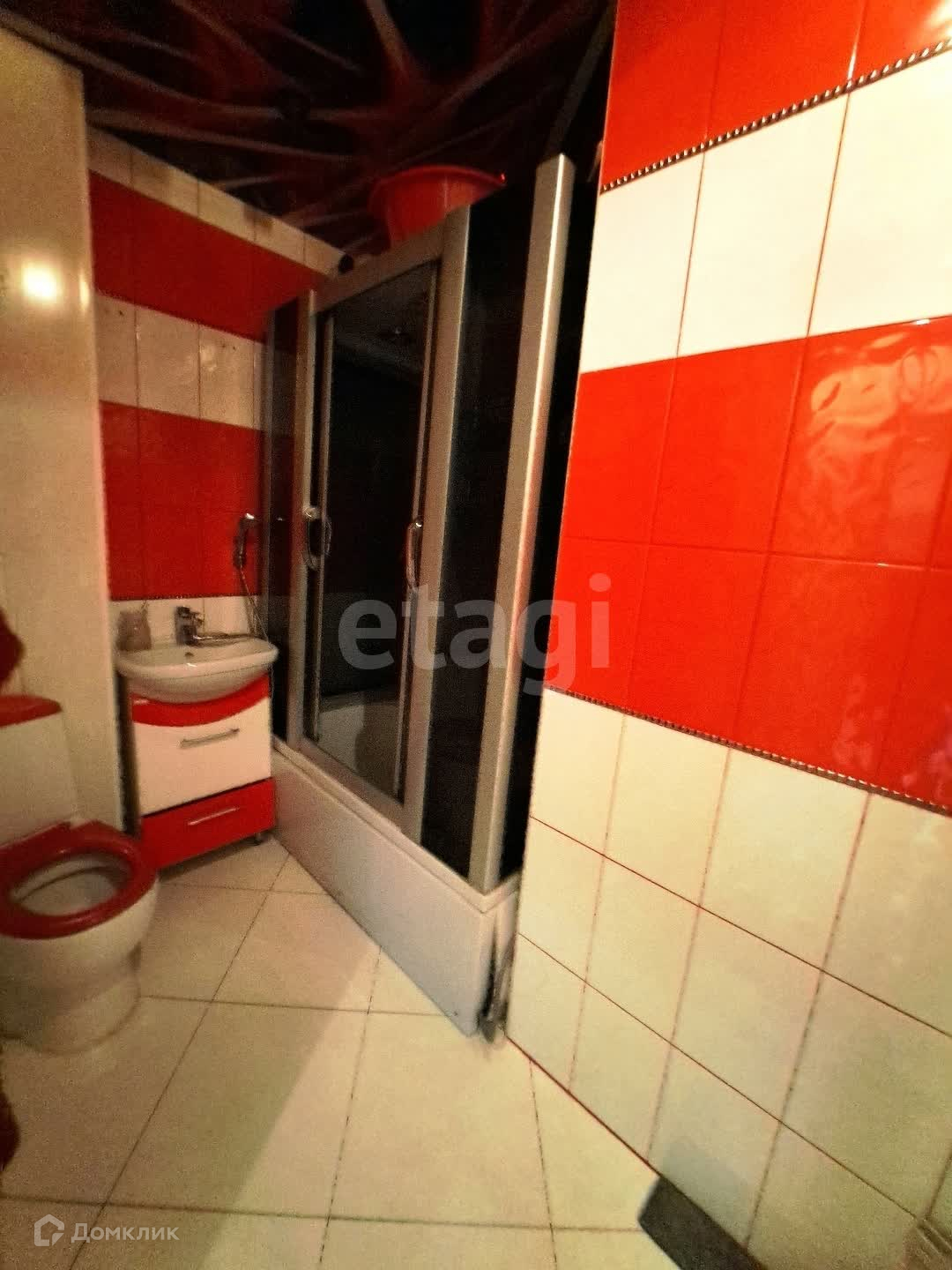 Ванная комната отделана кафель, стоит большая душевая кабина.