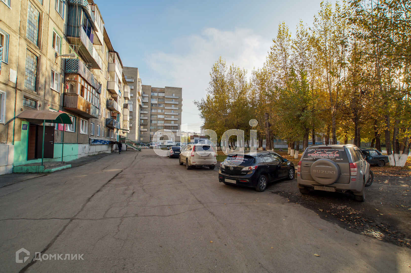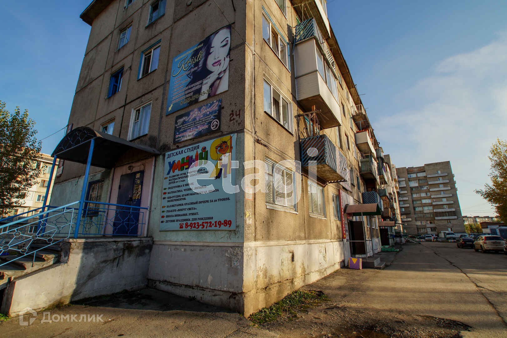 Рядом садики, школы, автобусные остановки, крыльцо и рекламная вывеска обозревается с проходной улицы микрорайона.