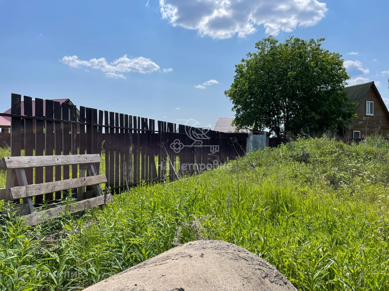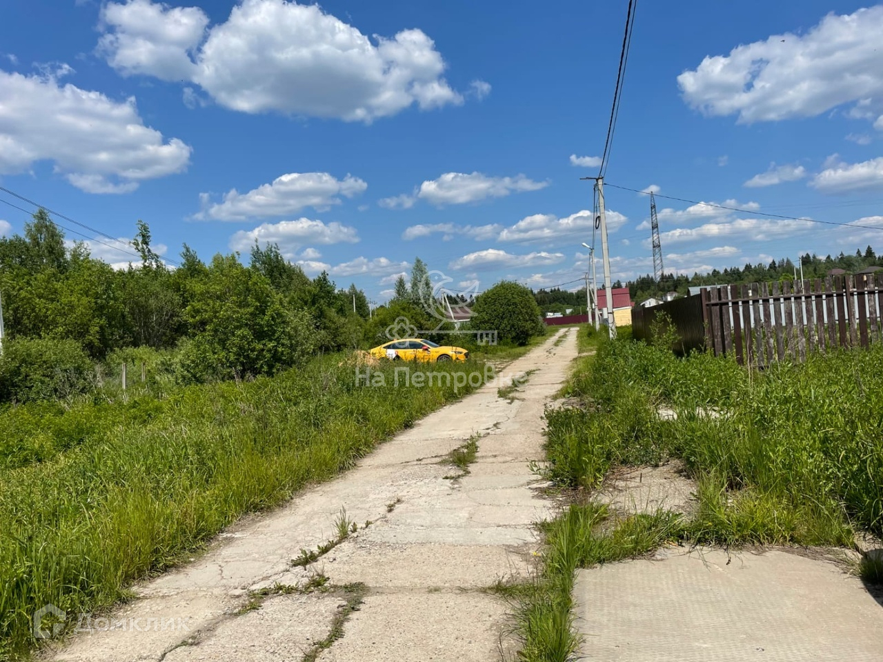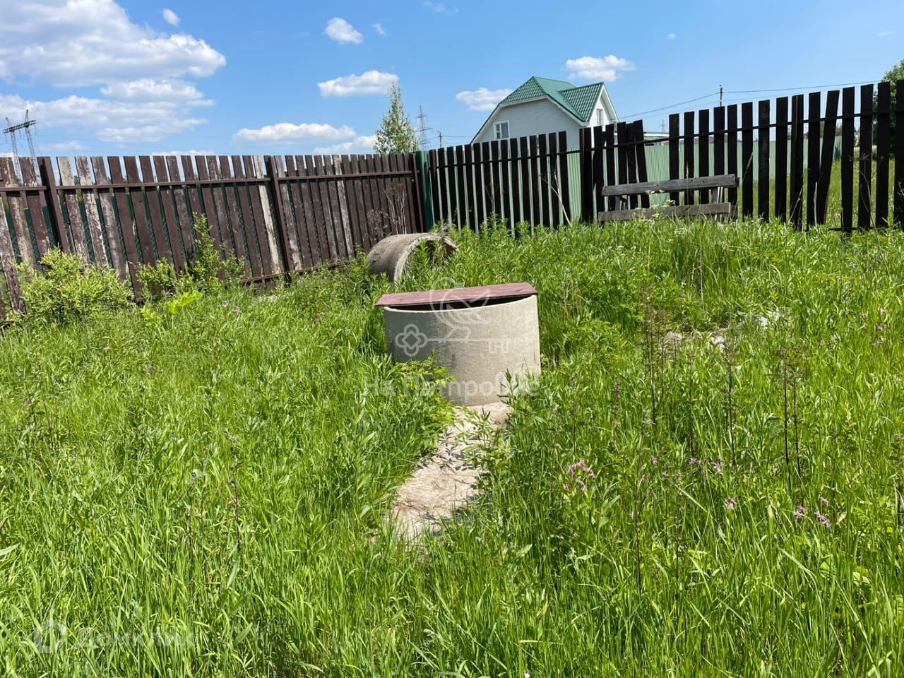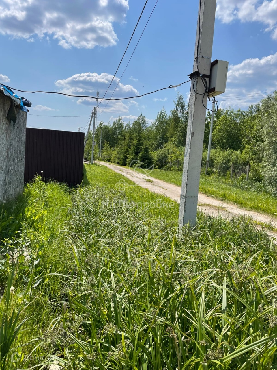 Участок правильной прямоугольной формы огорожен забором из профнастила. Электричество 15 кВт, столб на границе.
