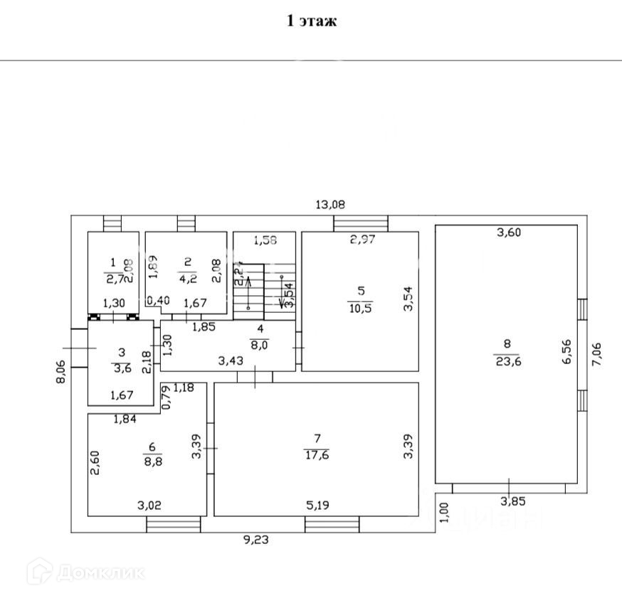 На 1 этаже расположены: прихожая, котельная, санузел с душевой кабиной, кухня-гостиная, спальня и коридор с лестницей на 2 этаж.