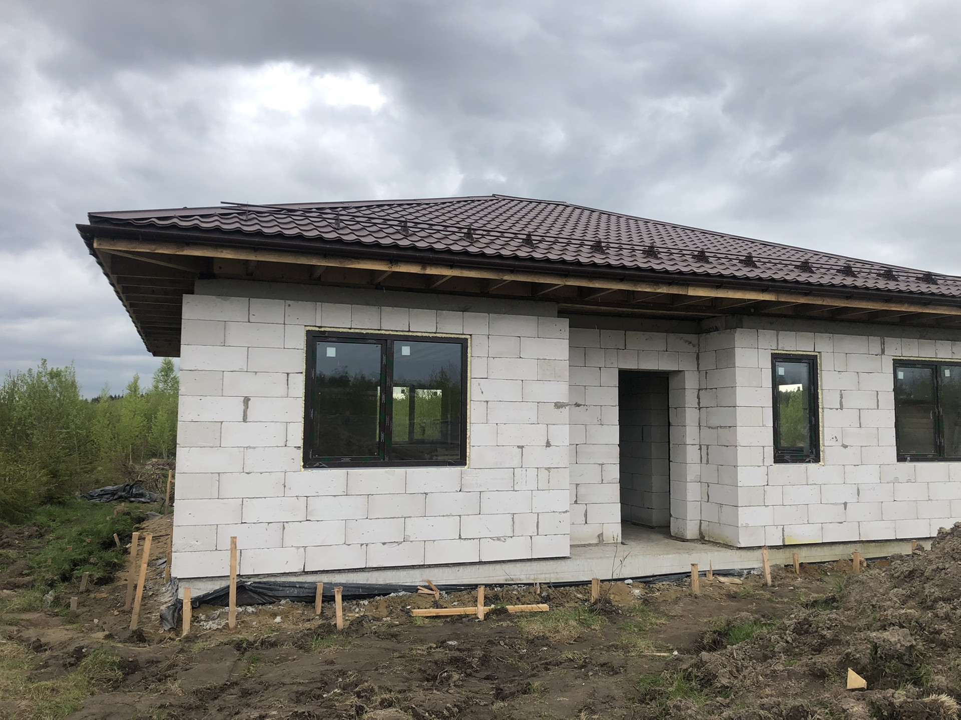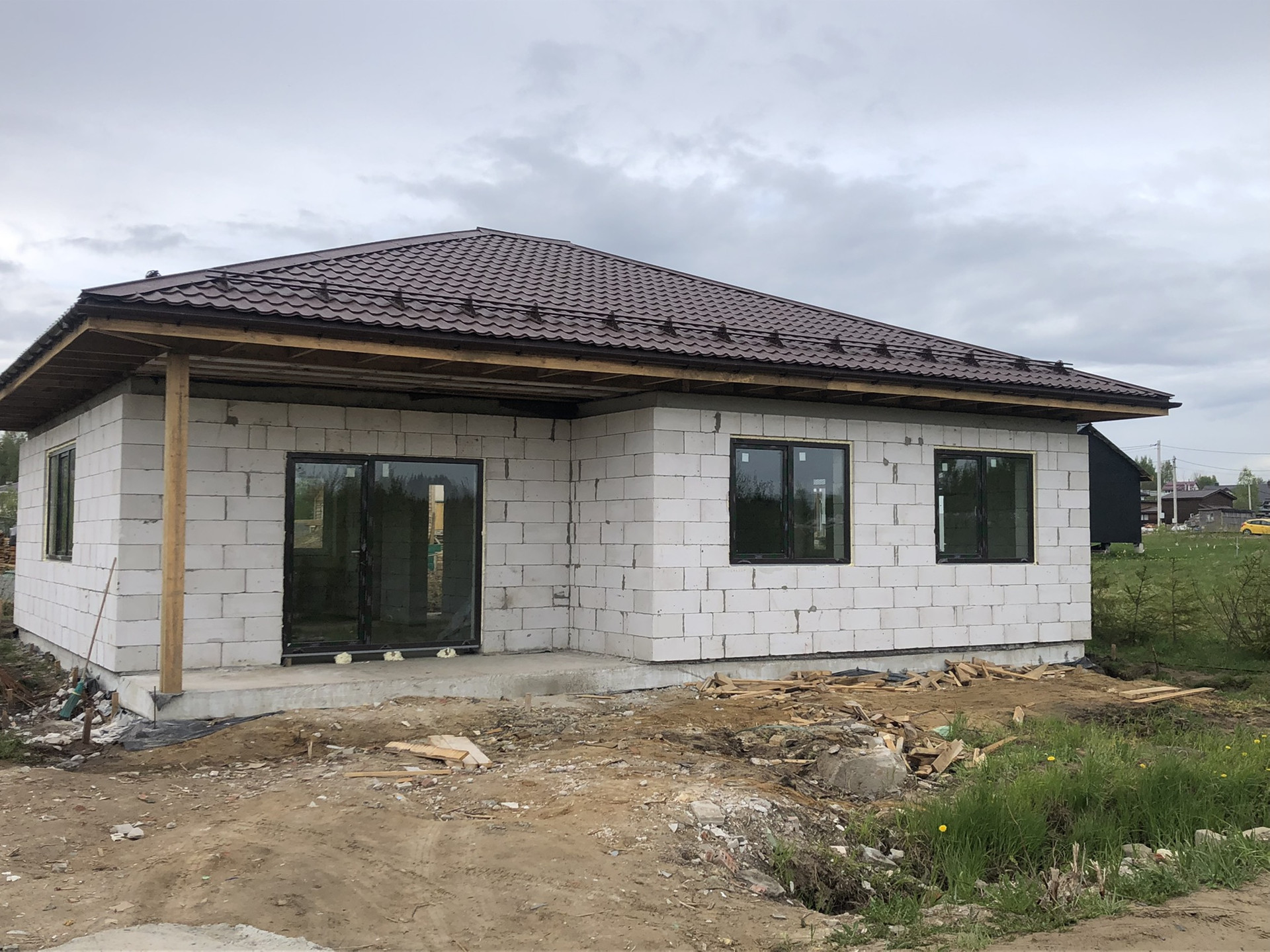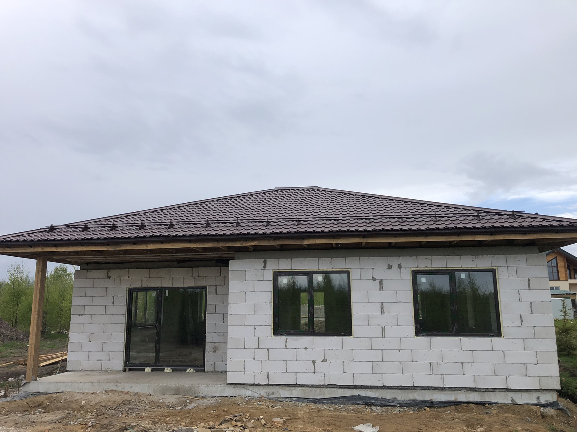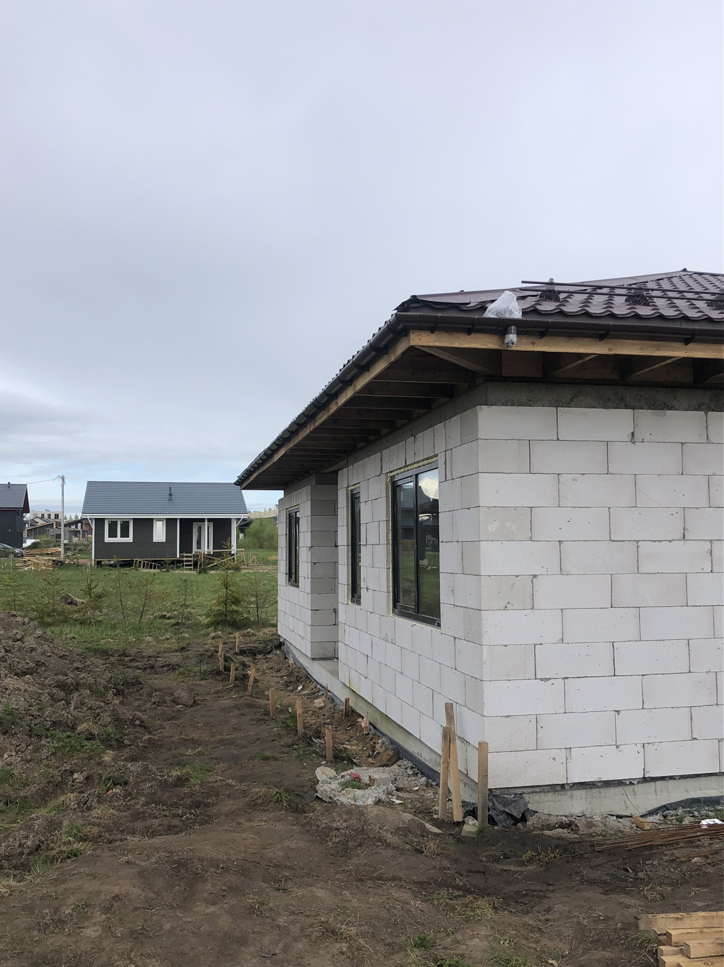 Продаётся дом 108м2 В 8км от СПБ (10 минут от КАД, Новоприозерское шоссе без пробок), Дом и земля в Собственности!!! Подходит под ИПОТЕКУ. д. Вартемяги, КП Софийские Сады, новый 1-этажный коттедж из газобетона, без внутренней отделки. Фундамент – плита, кровля – черепица, большие двухкамерные окна. Участок в собственности на участке посажены ели и березы.