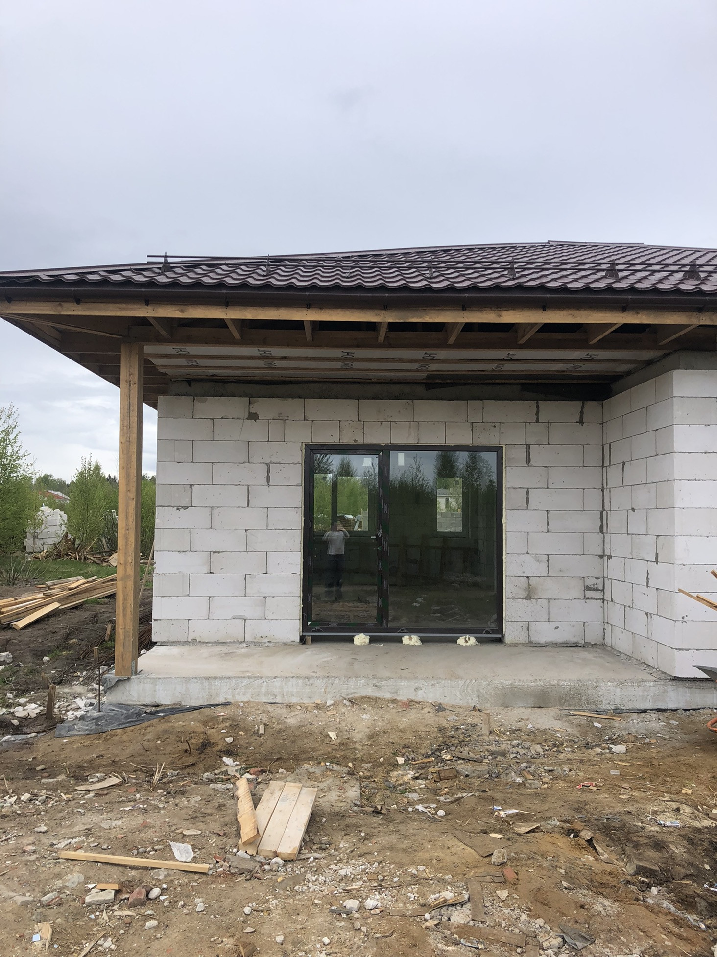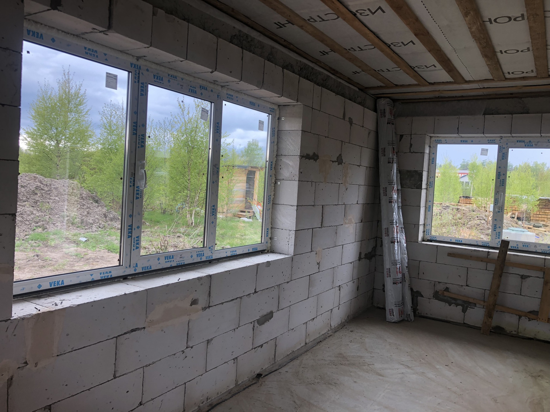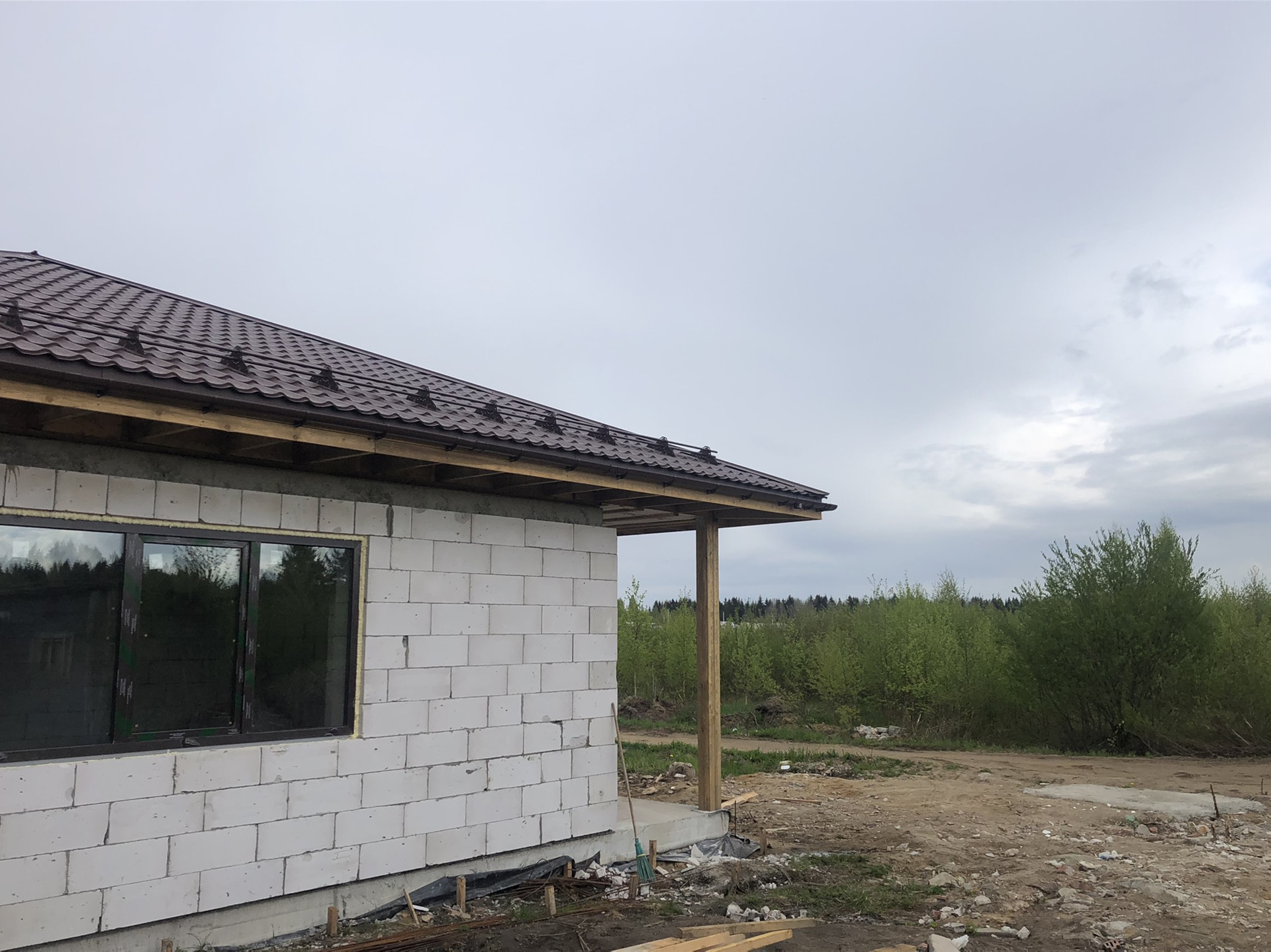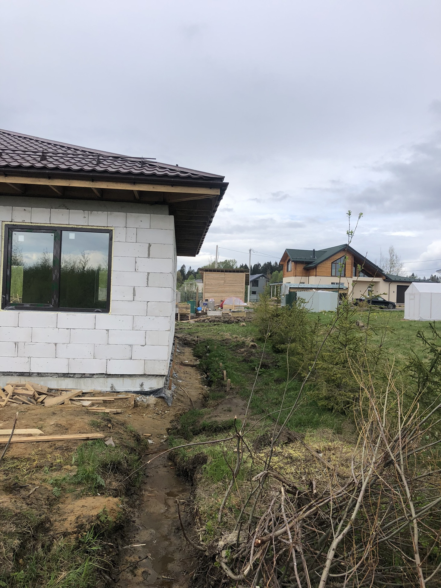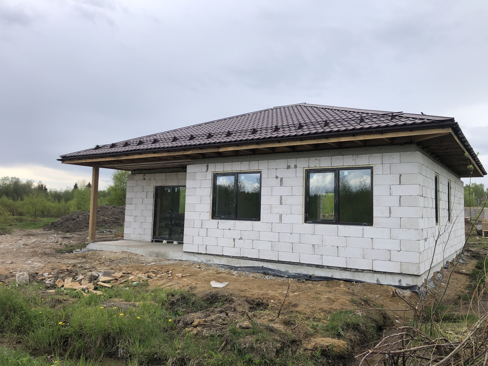 Продаётся дом 108м2 В 8км от СПБ (10 минут от КАД, Новоприозерское шоссе без пробок), Дом и земля в Собственности!!! Подходит под ИПОТЕКУ. д. Вартемяги, КП Софийские Сады, новый 1-этажный коттедж из газобетона, без внутренней отделки. Фундамент – плита, кровля – черепица, большие двухкамерные окна. Участок в собственности на участке посажены ели и березы.