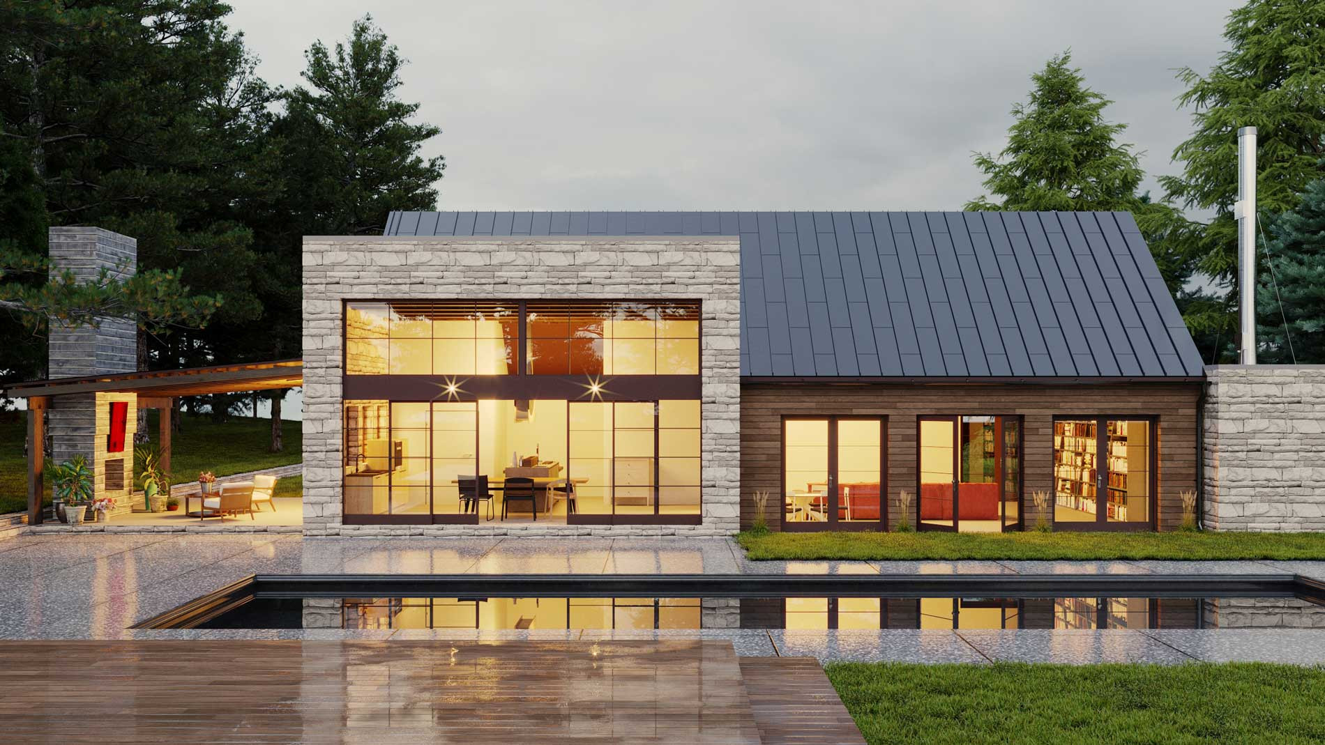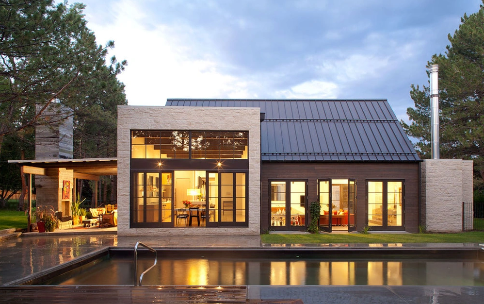 Лаундж зона с камином является гостеприимной частью дома.