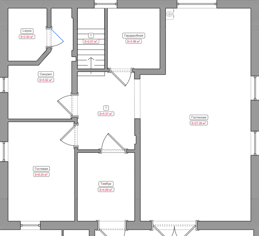 Общая площадь 140 м. кв.(120 м. кв. дом плюс 20 м. кв. балкон-терраса). Включает тамбур, 4 спальни, кухню-гостинную, 2 санузла, 2 кладовых, сауну, чердак (еще одна огромная кладовая порядка 30м2), террасу и балкон.
