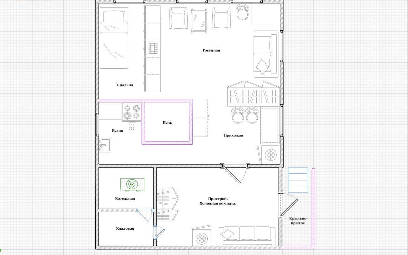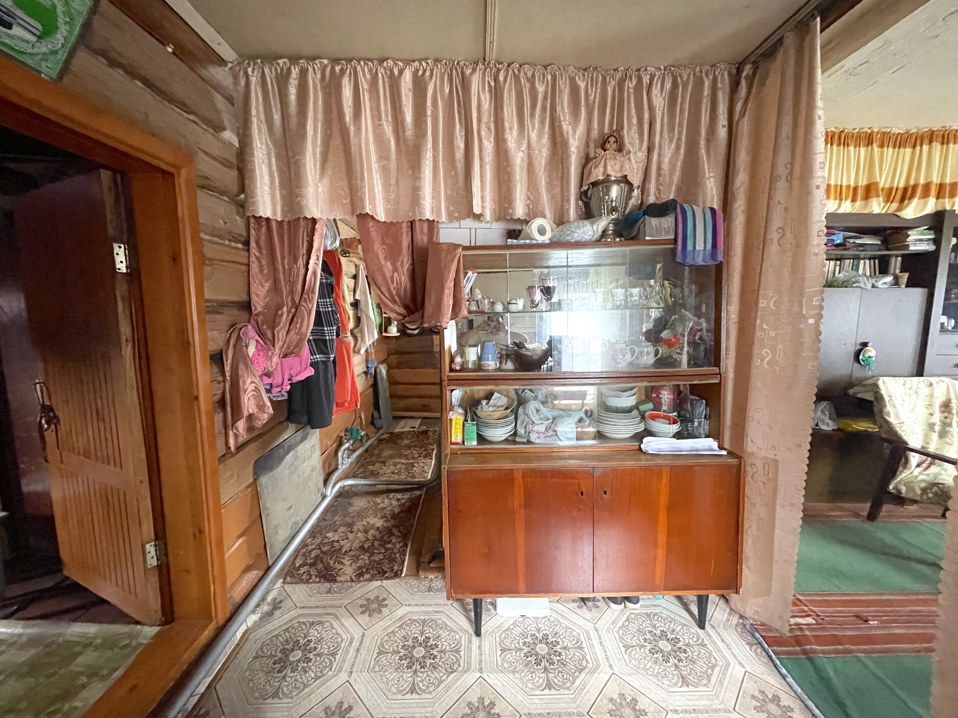 В доме все функционирует, он полностью жилой, теплый. Общее помещение квадратной формы, разделено печью и шкафами на четыре комнаты: гостиная, спальня, кухня, прихожая. На кухне установлена русская печка, газовая плита, мойка, стол. В гостиной остаются все шкафы, диван, кресла и стулья. Мебель остается частично. К дому примыкает помещение со вторым светом (летом здесь прохладно), котельной (установлено газовое оборудование), кладовой и зоной отдыха (диван, шкаф, холодильник) и закрытое крыльцо. В дом заведены центральное водоснабжение (вода чистейшая, можно пить прямо из крана!), магистральный газ, центральное электричество. Дом отапливается газом.