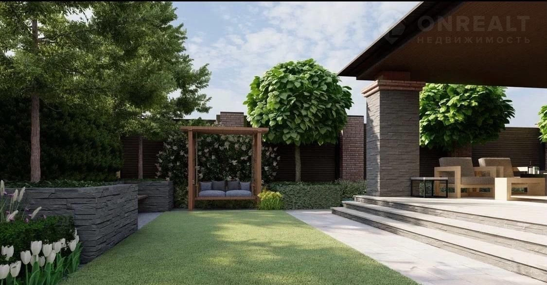 * На задней части двора имеется мангальная зона представленная стационарным мангалом в беседке, а также элементы ландшафтного дизайна.
