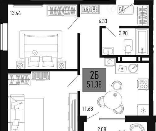 Общая площадь 51.4 м2