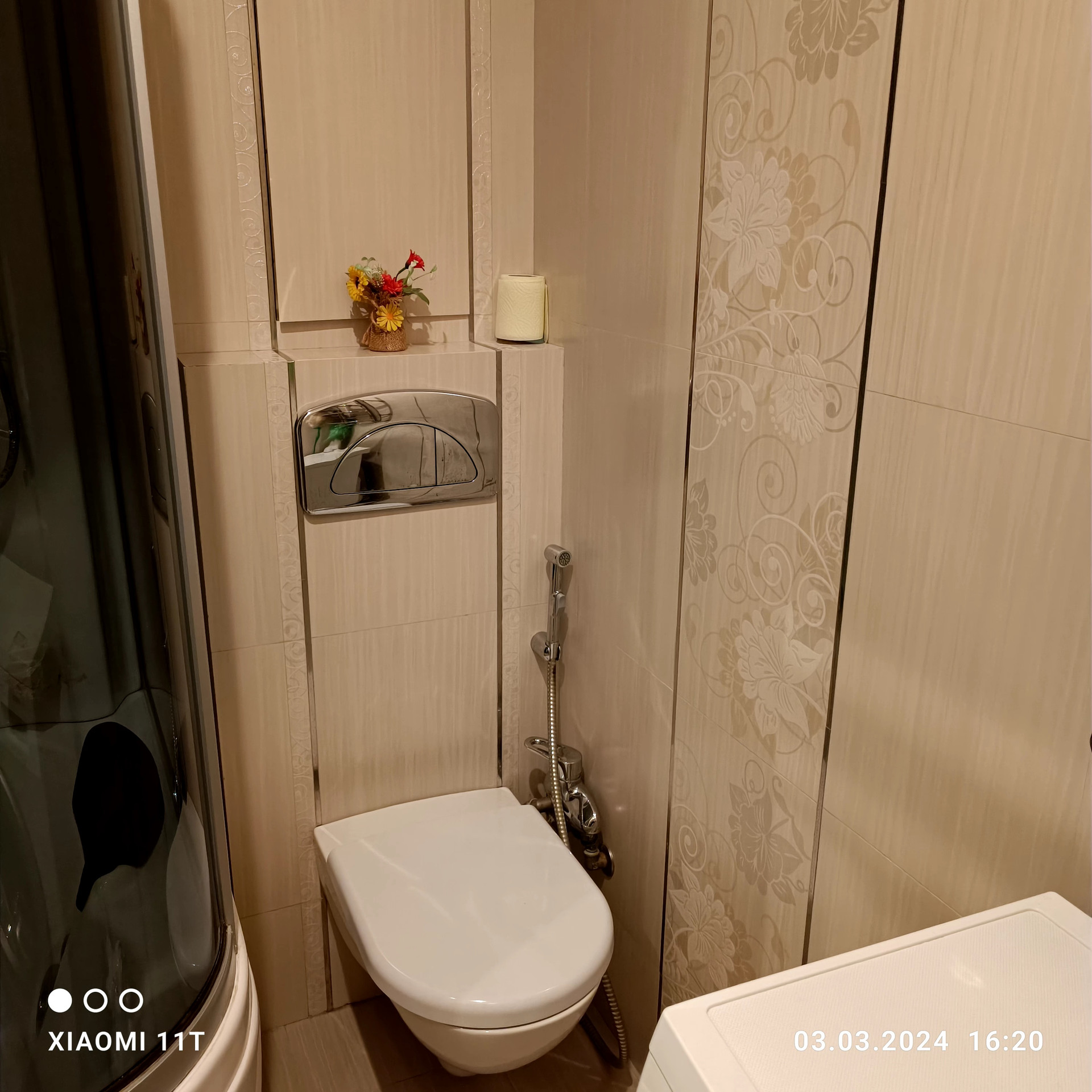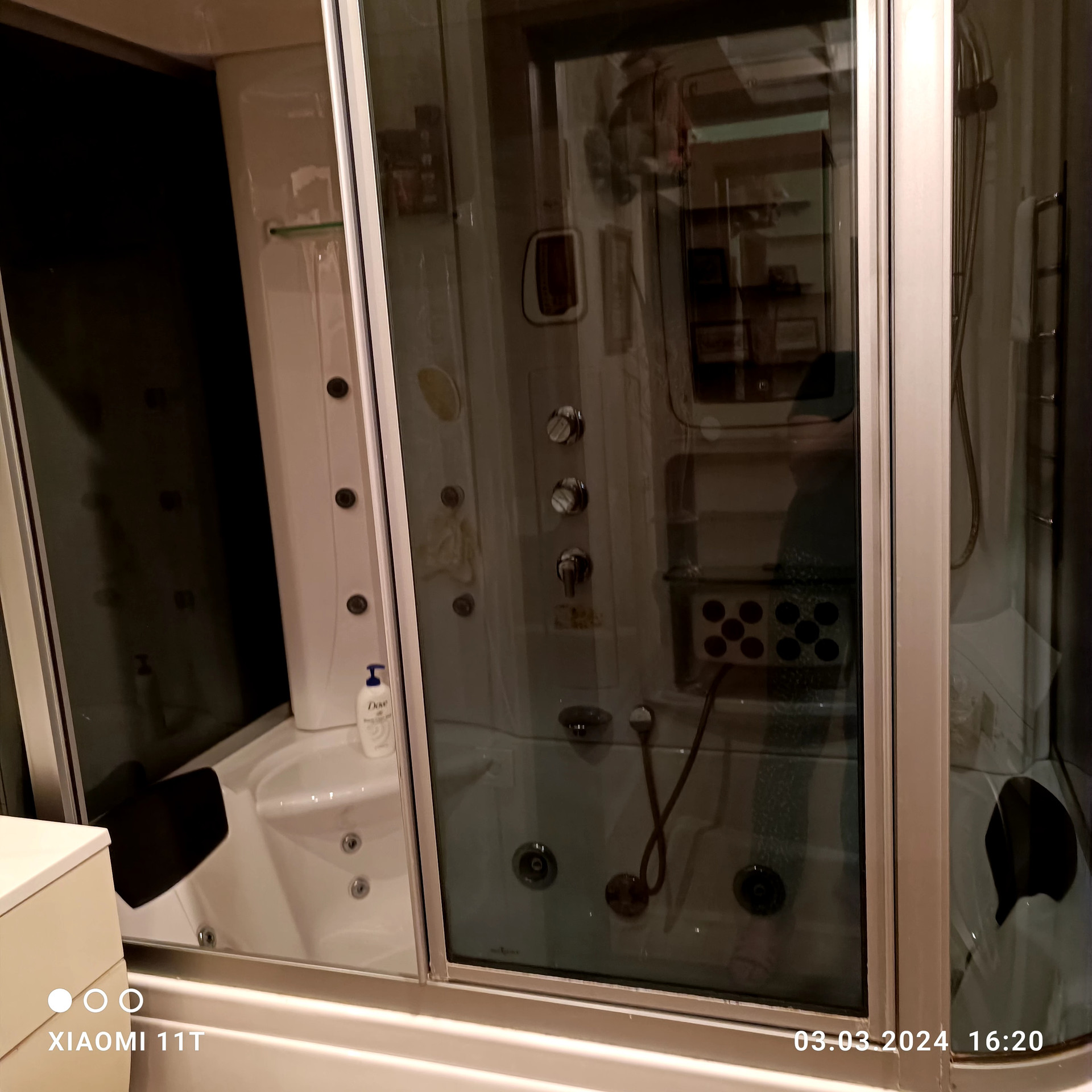 -совмещенный санузел 4,6 м2, укомплектованный большой душевой -ванной джакузи , плитка уложена по всему санузлу .