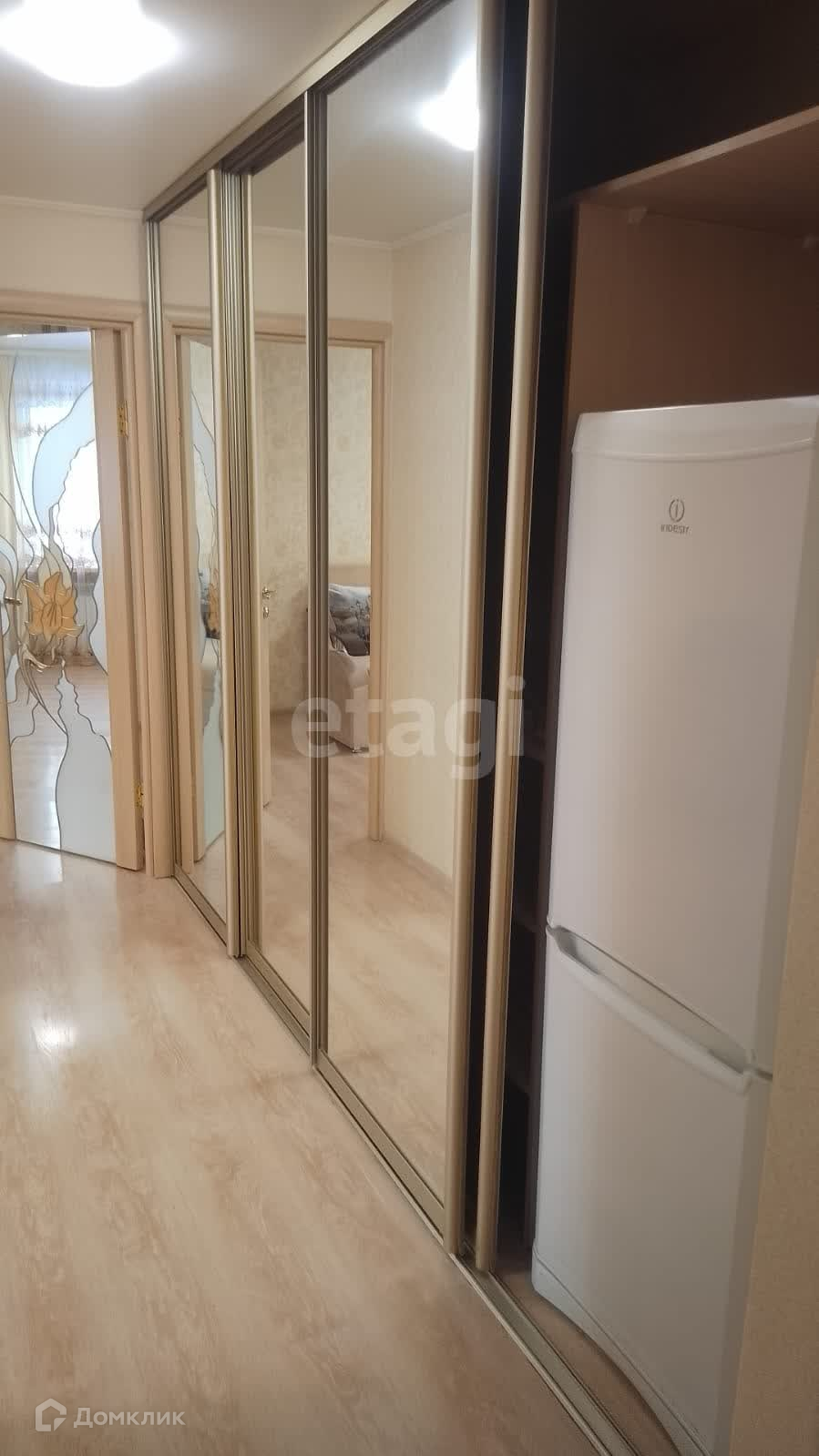 Место под холодильник отведено в шкаф-купе, в двух шагах от кухни, что дополнительно дарит кухне свободную площадь и удобство.
