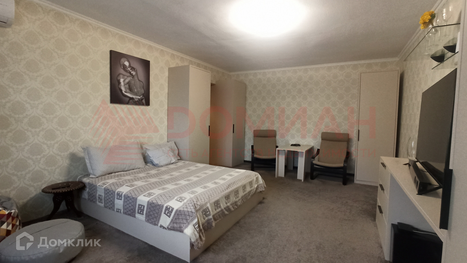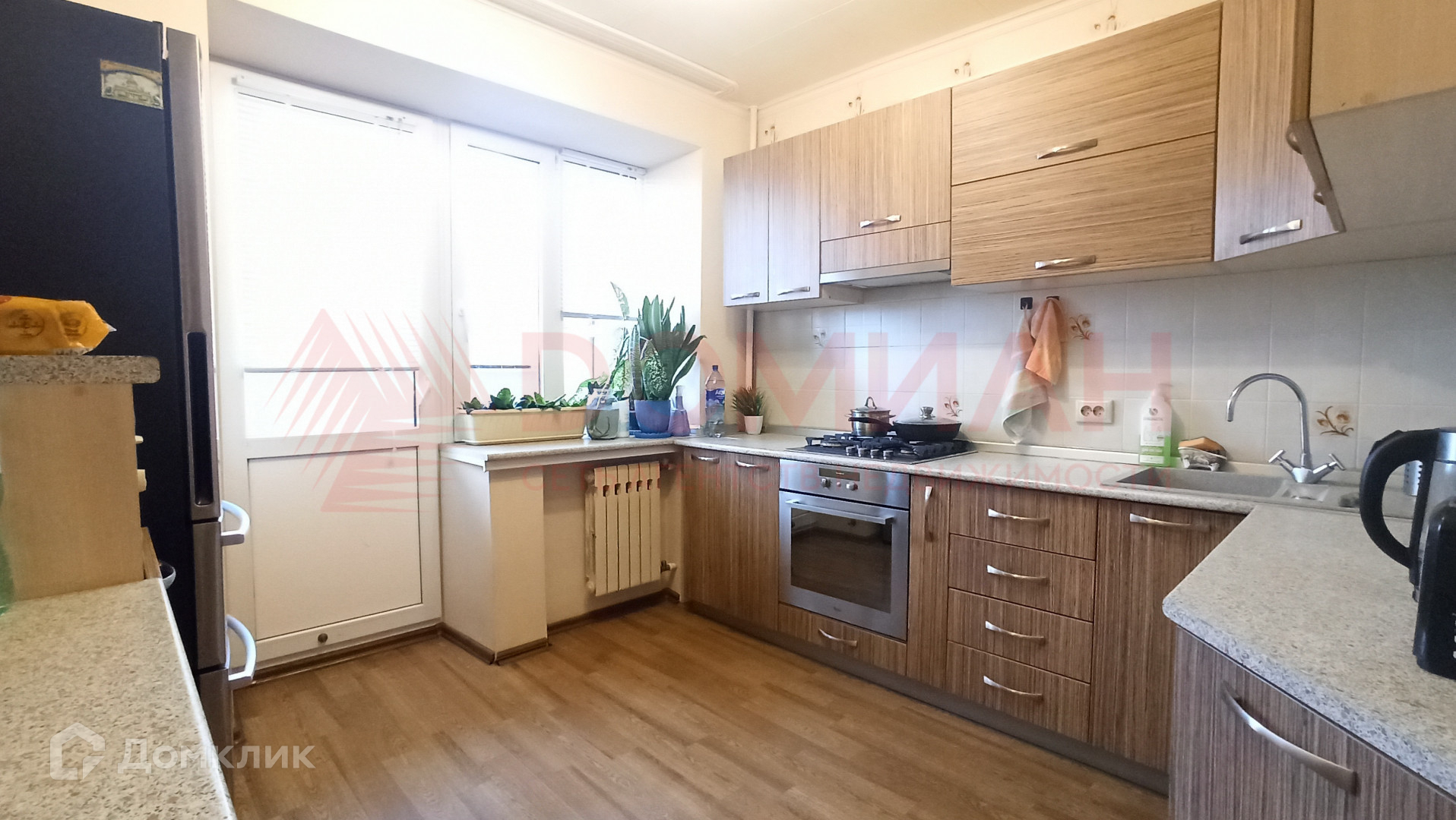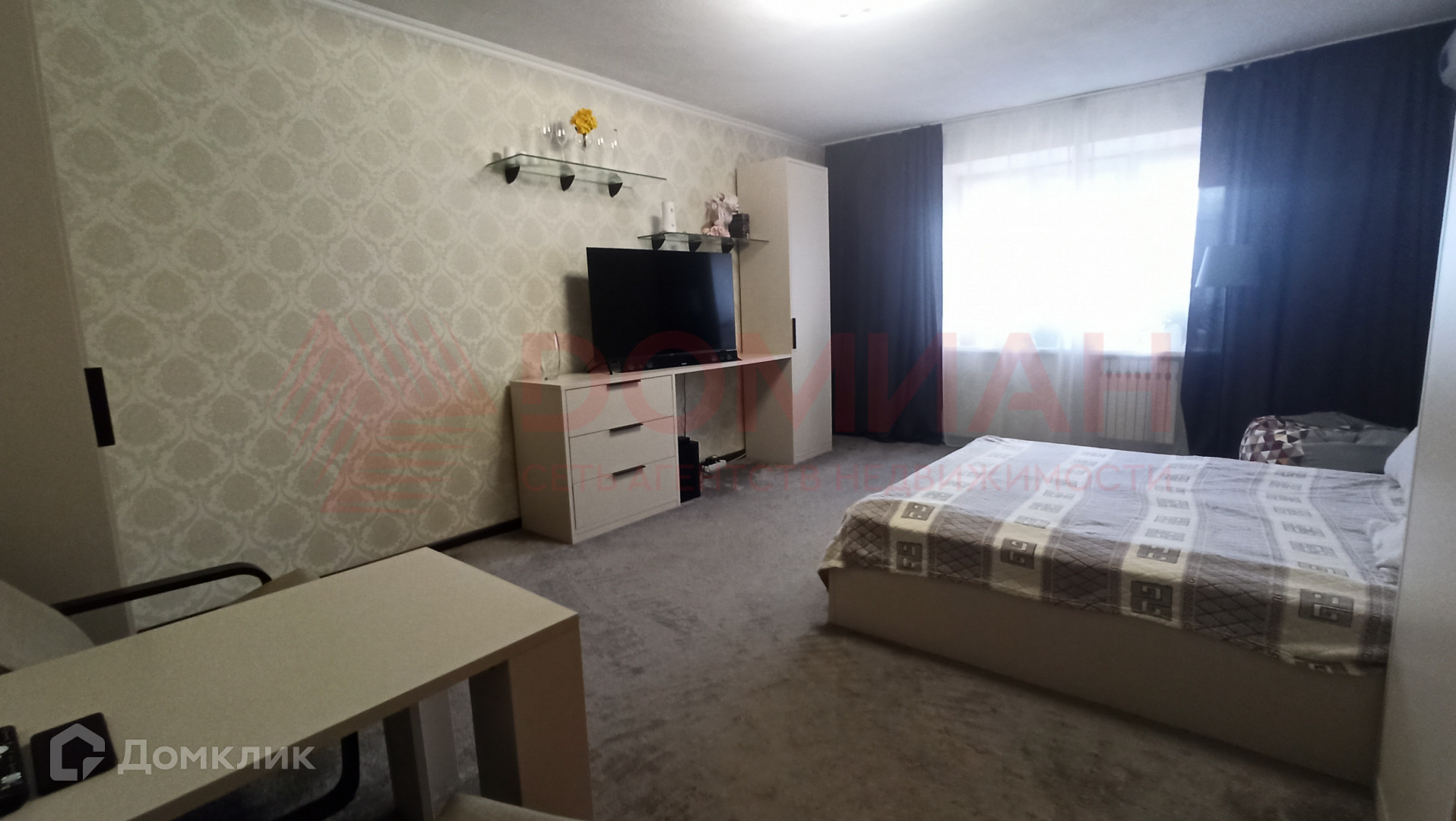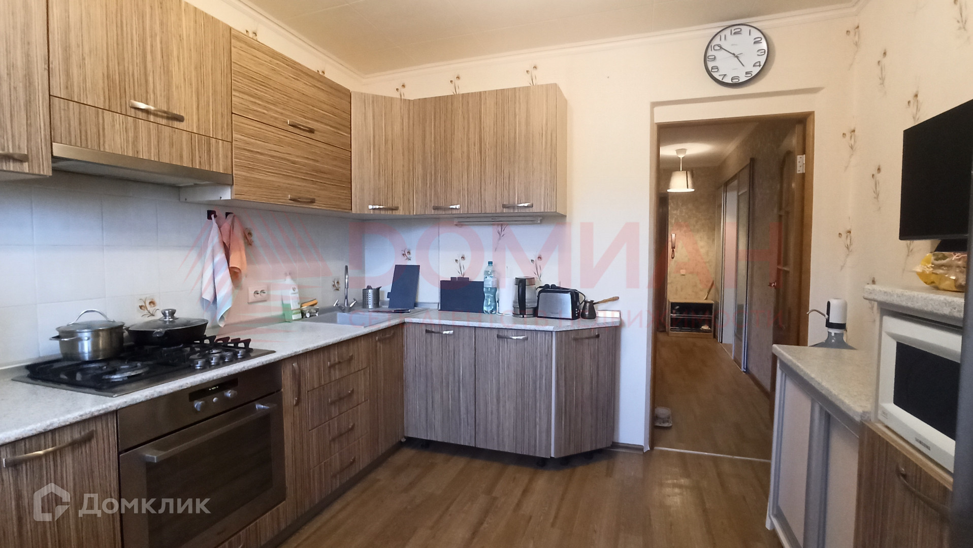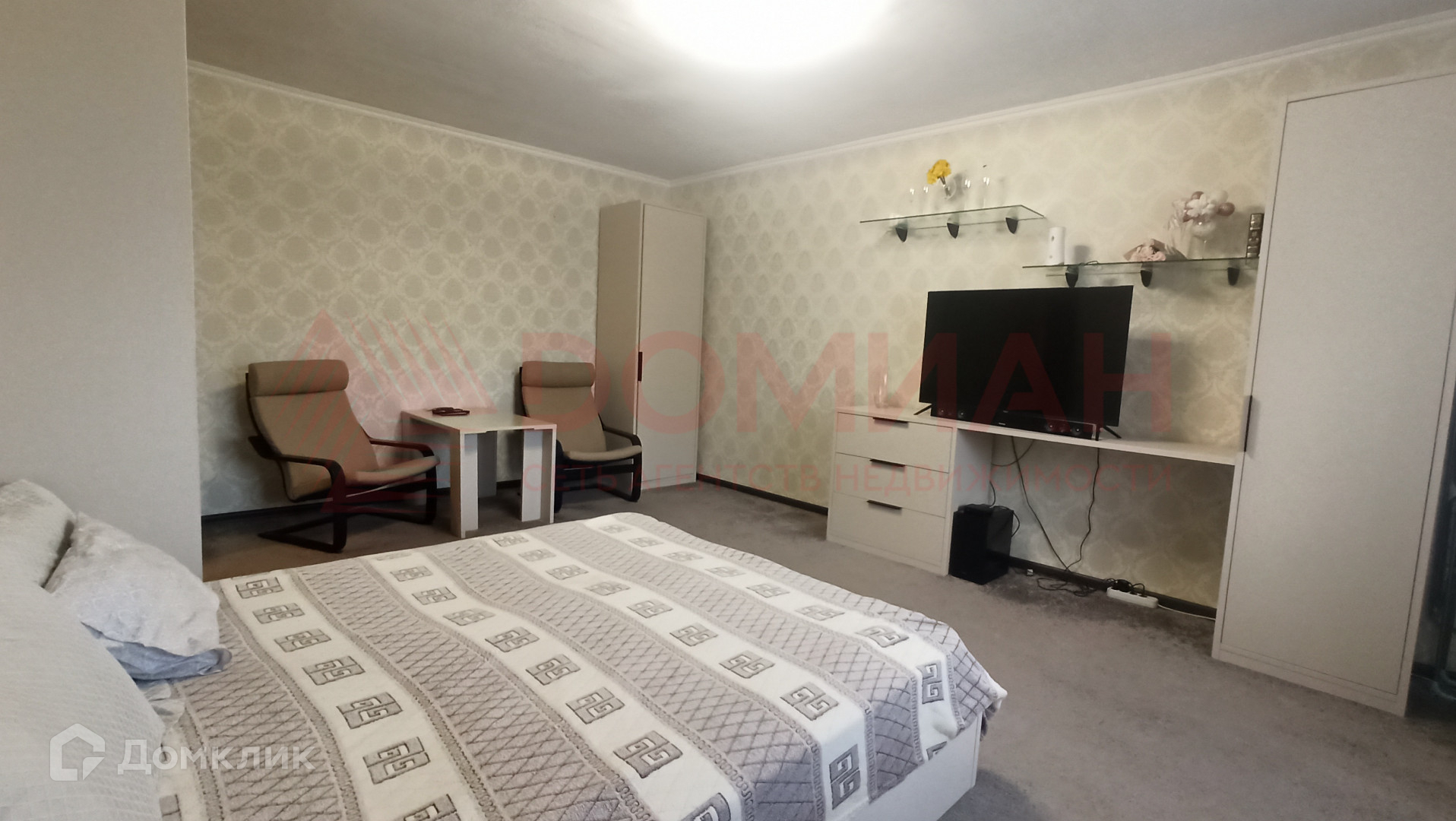 В квартире современная планировка: большая комната, просторная кухня с выходом на застекленный балкон, вместительная гардеробная, совмещенный санузел.