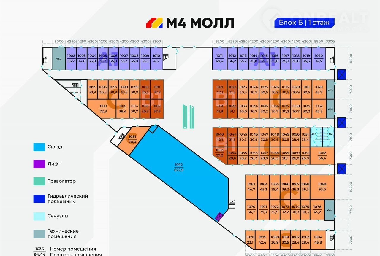 — 2 этажа, 2 корпуса (А и Б), 2 траволатора, 3 грузопассажирских лифта, 5 подъёмников