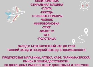 К суточной аренде предлагается квартира студия на 3 этаже в 4-этажном доме. Окна квартиры на внутренний двор. Одна лоджия. Есть бытовые электроприборы: холодильник, посудомойка, утюг, фен, телевизор, микроволновая печка, стиральная машинка, сплит система, кухонная плита. Есть интернет, кабельное ТВ. Можно проживать с ребенком. Комиссия не взимается... |