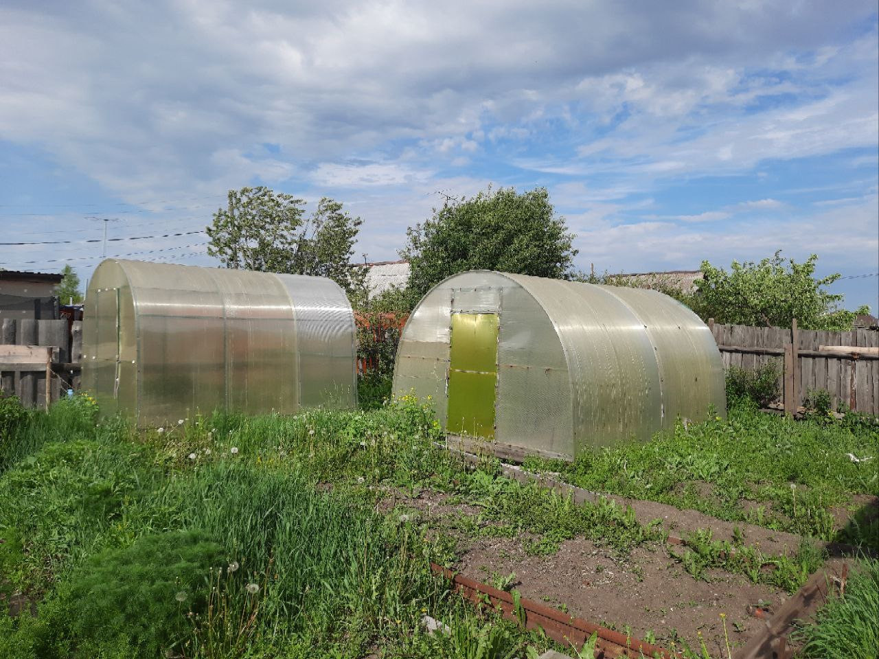 На участке размером 5,2 сотки растут малина, смородина, вишня, а также установлены две теплицы, есть земля, которую можно использовать для посадки. На участке есть собственный колодец для полива земли, который не пересыхает и в жаркое лето.