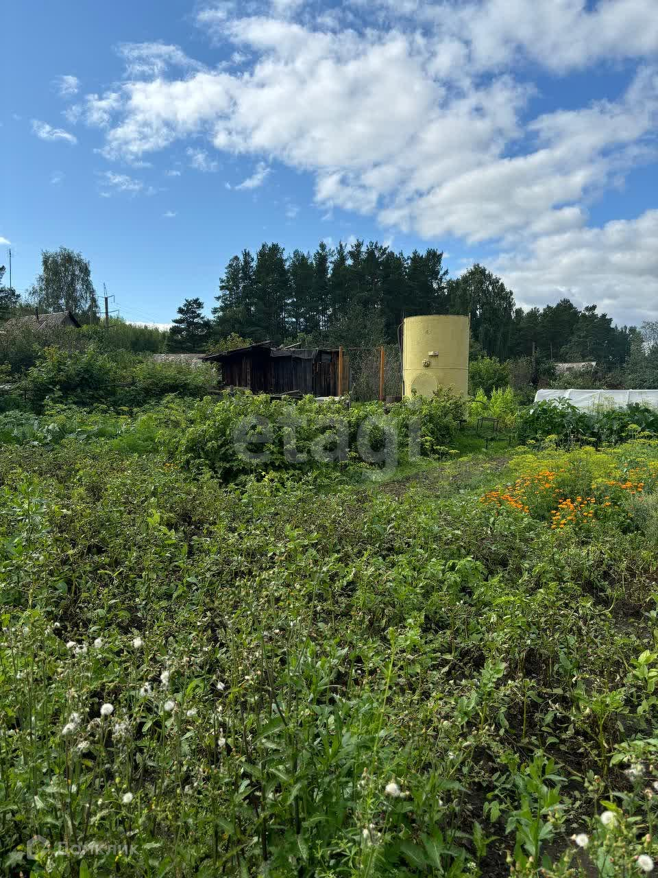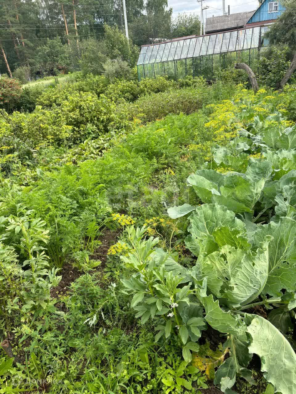 Имеются плодовые деревья: смородина черная и красная,малина,ирга, облепиха,слива.В теплицах посажены огурцы,помидоры.Также картофель,кабачки,горох,клубника,перец,бобы.