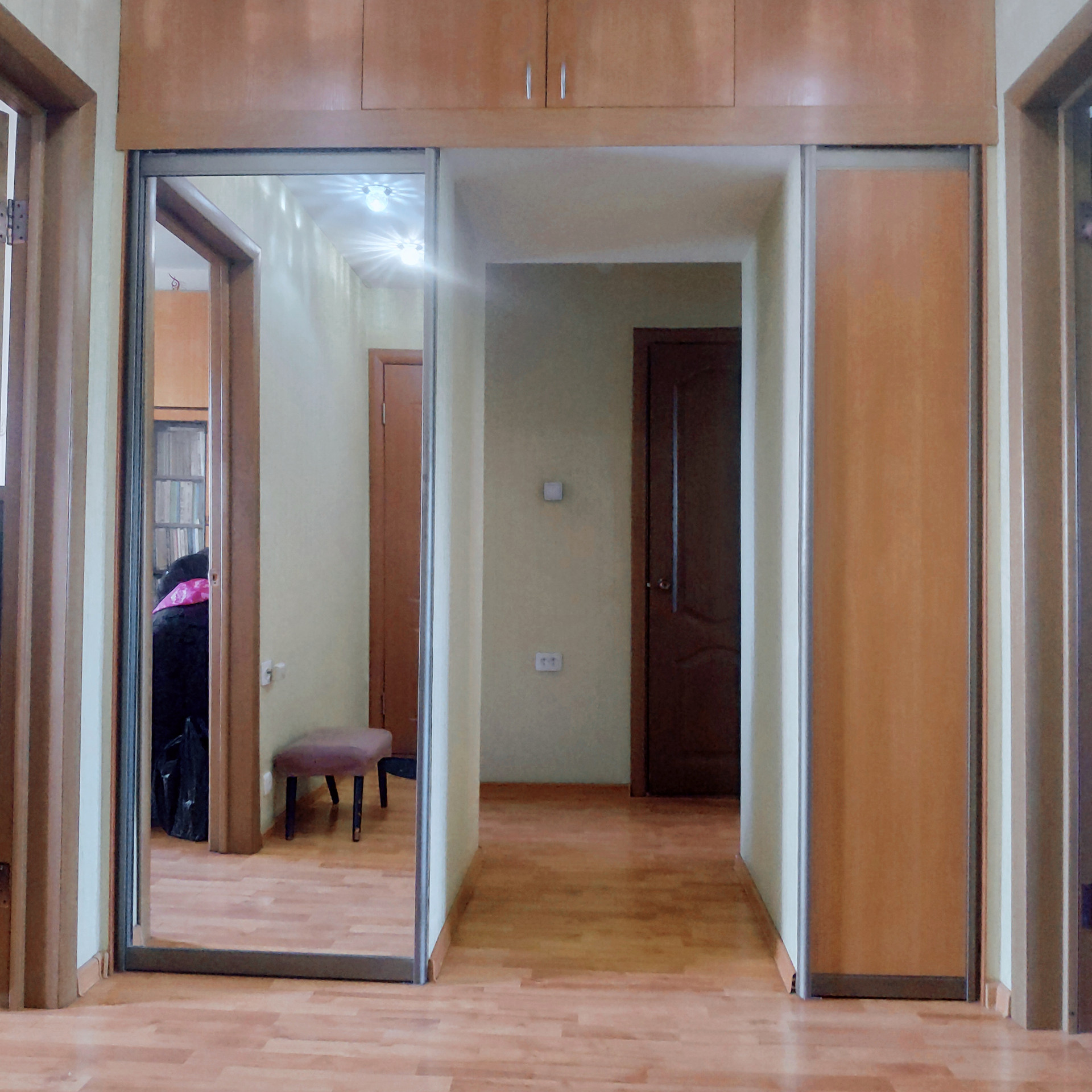 Во дворе расположены детская и спортивные площадки. Есть придомовая парковка. Рядом находится также автобусная остановка, видно из окон квартиры.