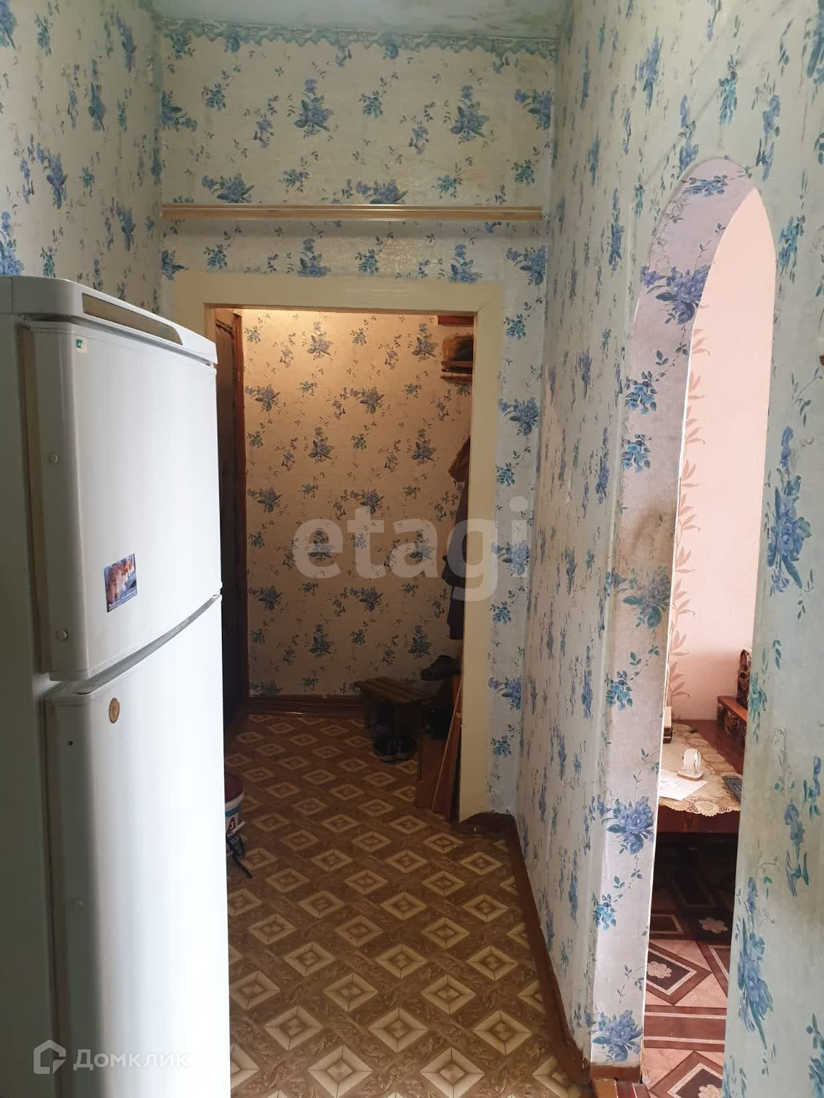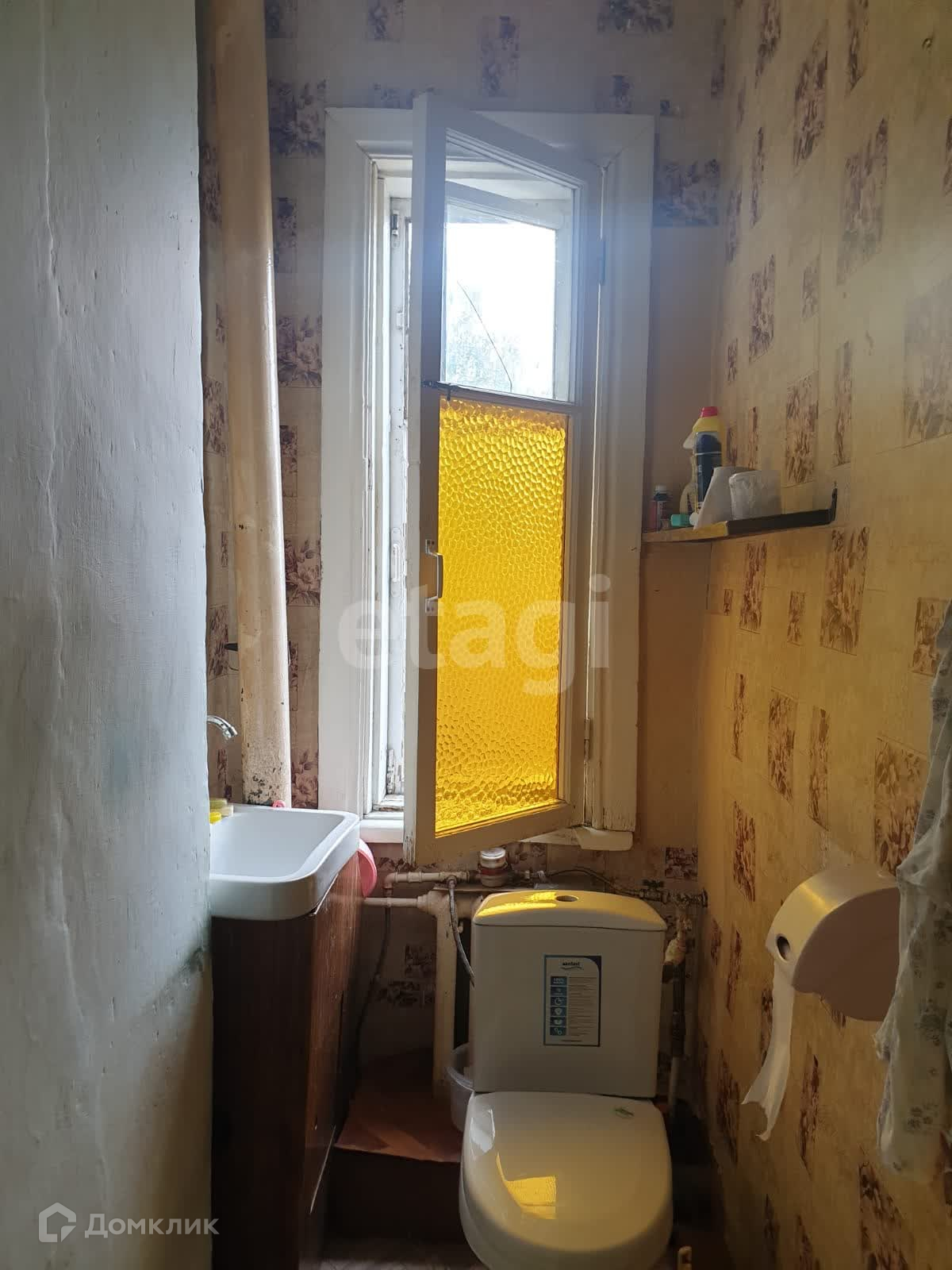 В квартире косметический ремонт: окна деревянные, поклеены обои, входная дверь хорошего качества.