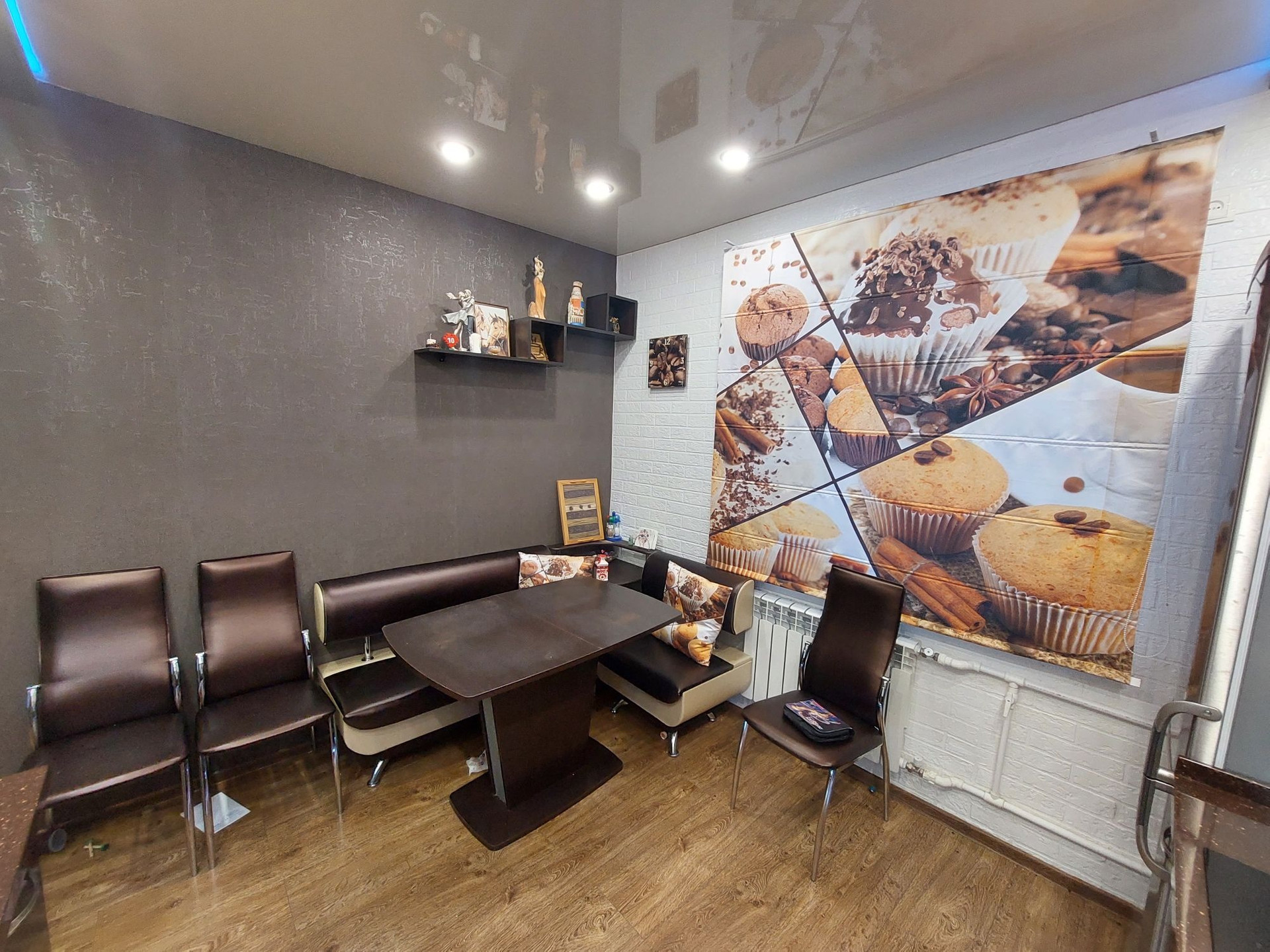 каменная столешница с 2 раковинами, кулер, римские шторы, обеденная зона, декоративная штукатурка под кирпич ручной работы, холодильник.