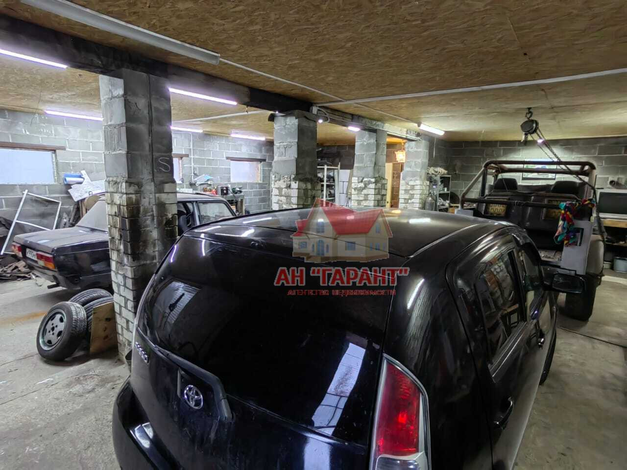 К дому пристроенный гараж на три машиноместа, есть смотровая яма, в гараж заведена вода, есть санузел. В гараж подведено 380 Вольт.