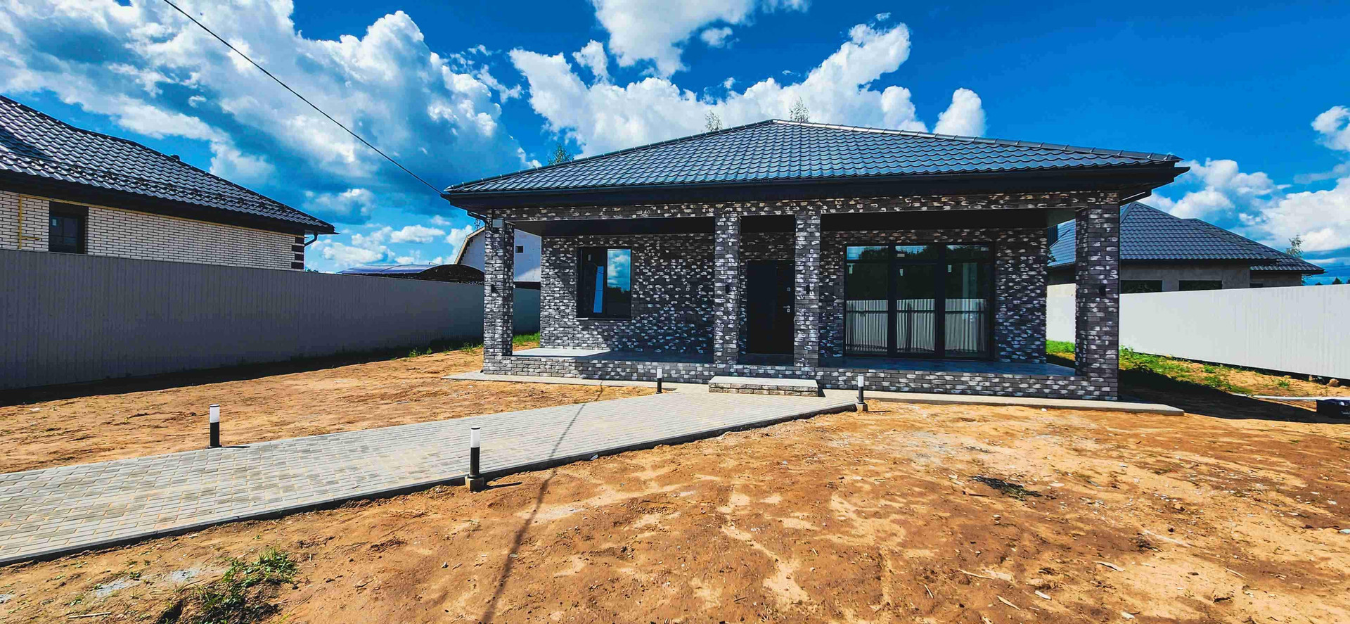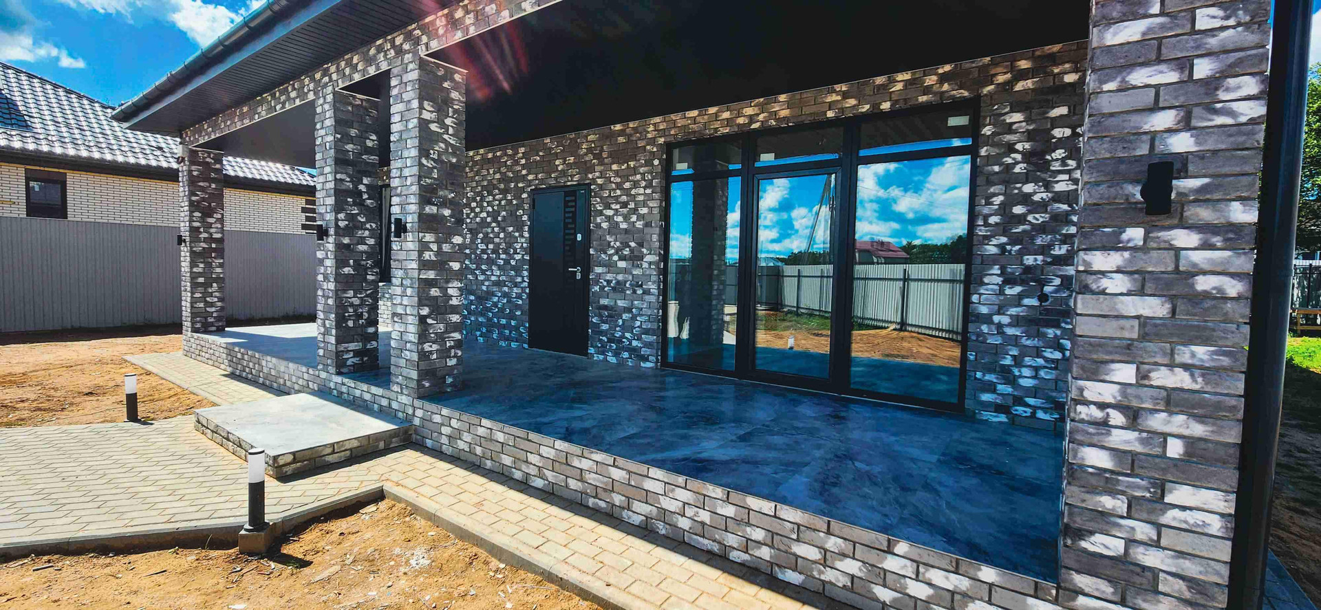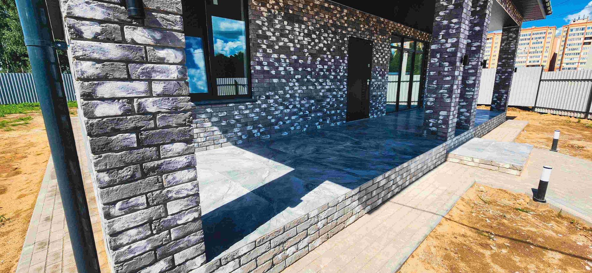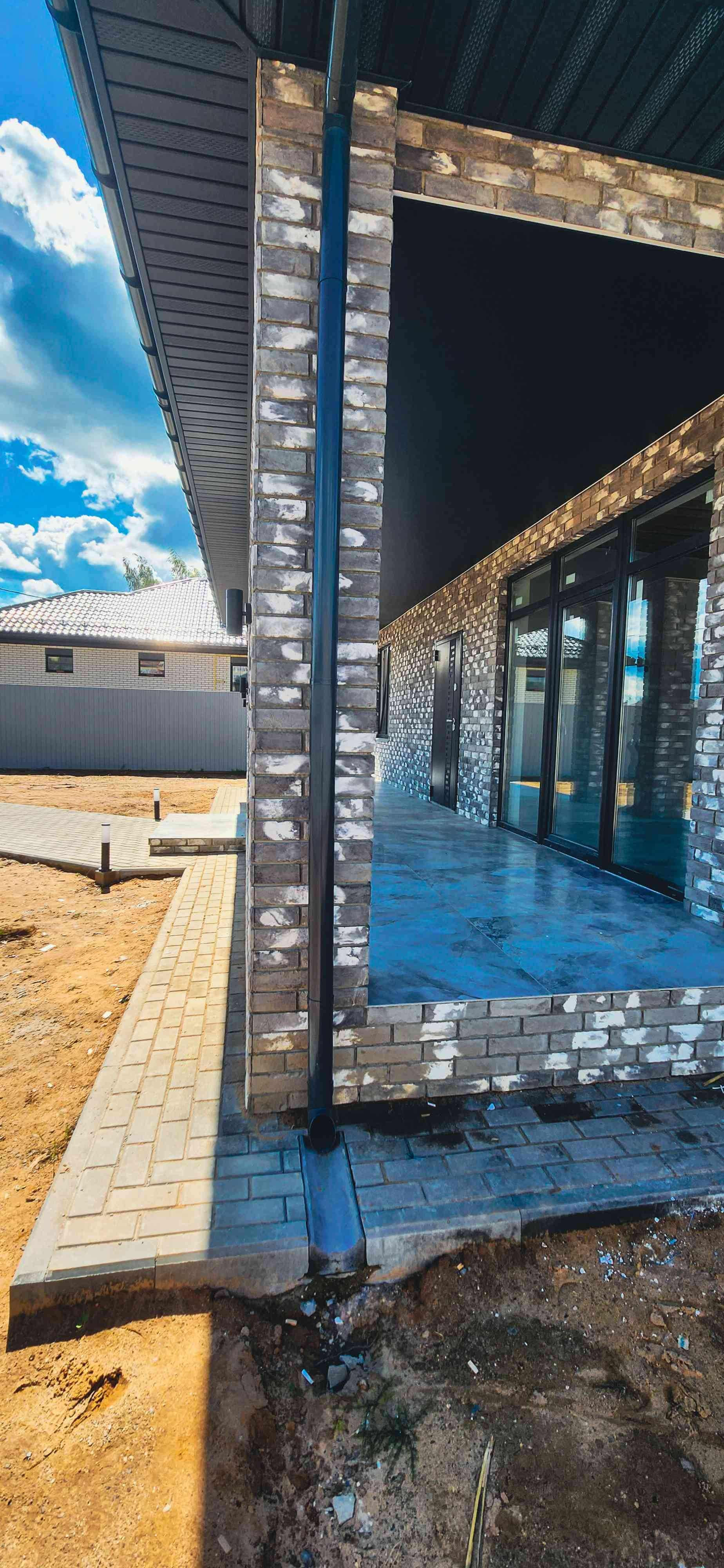 Брусчаткой выложено парковочное место, дорожка к центральному входу, отмостка.