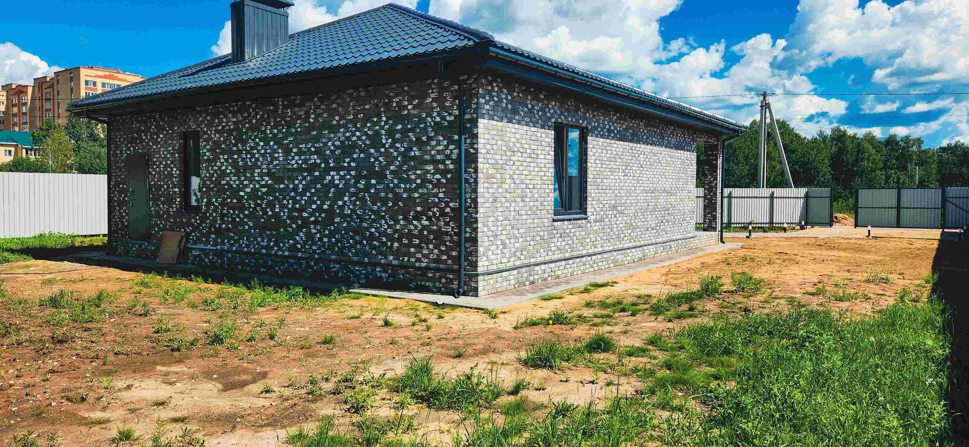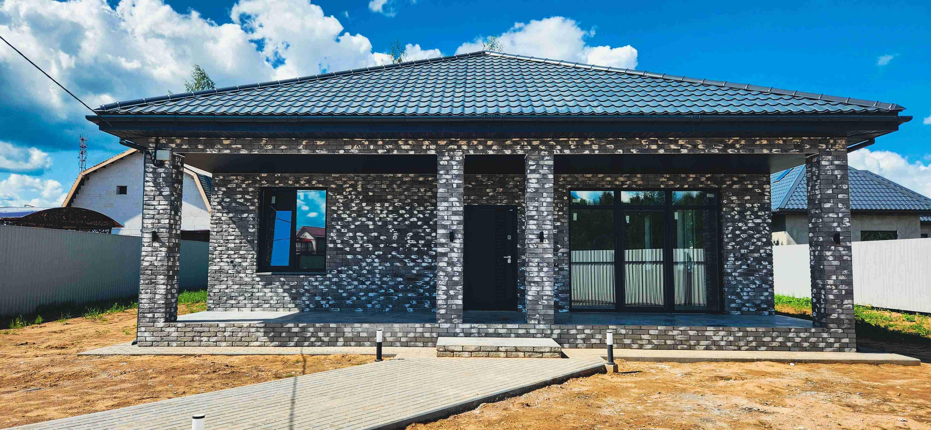 Одноэтажный дом общей площадью 145 кв.м . Выстроен из пеноблока фирмы Bonolit и отделан клинкерной плиткой по индивидуальному заказу. Фундамент ленточный + залита плита с утеплением пеноплексом высокой плотности. Крыша - металлочерепица с водосточной системой фирмы МеталлПрофиль цвет графит, окна - ПВХ 3-ные в кухне - гостиной имеется сдвижное окно для прямого выхода на веранду. Внутри дома выполнен полностью дизайнерский ремонт(двухуровненые парящие потолки с Led контурной подсветкой, стены выкрашены в светлые тона, установленна вся электрика цвета матовый графит, по всему дому монтированы теплые полы и уложена мраморная серая плитка 120х60)   Электричество 15 квт., канализация и вода городская, газ в доме. Установлен газовый котел фирмы navien deluxe.
