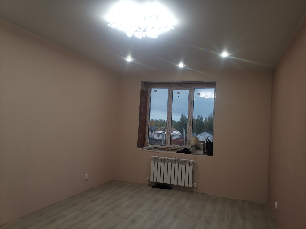 В комнате натяжной потолок, на полу ламинат.