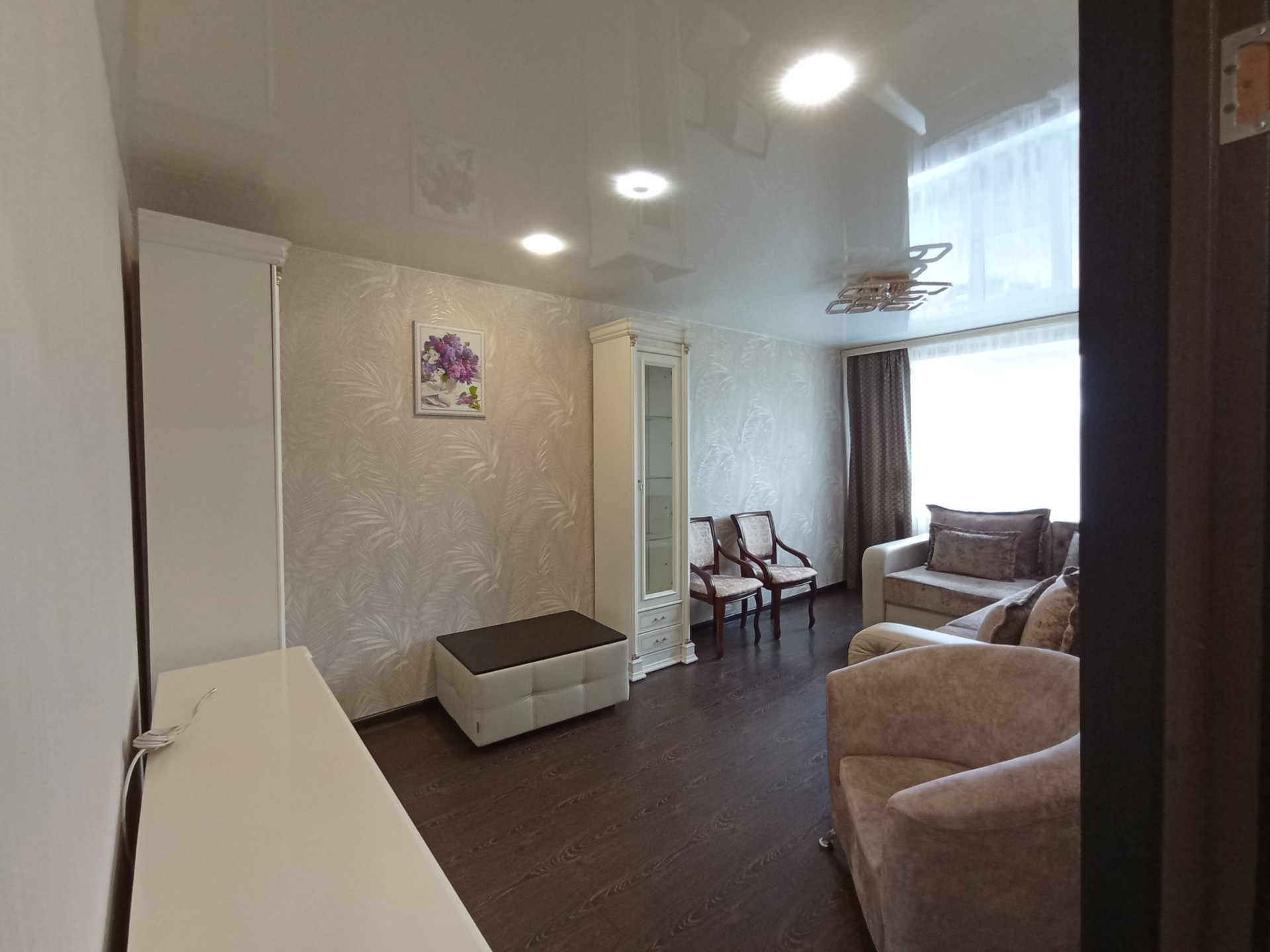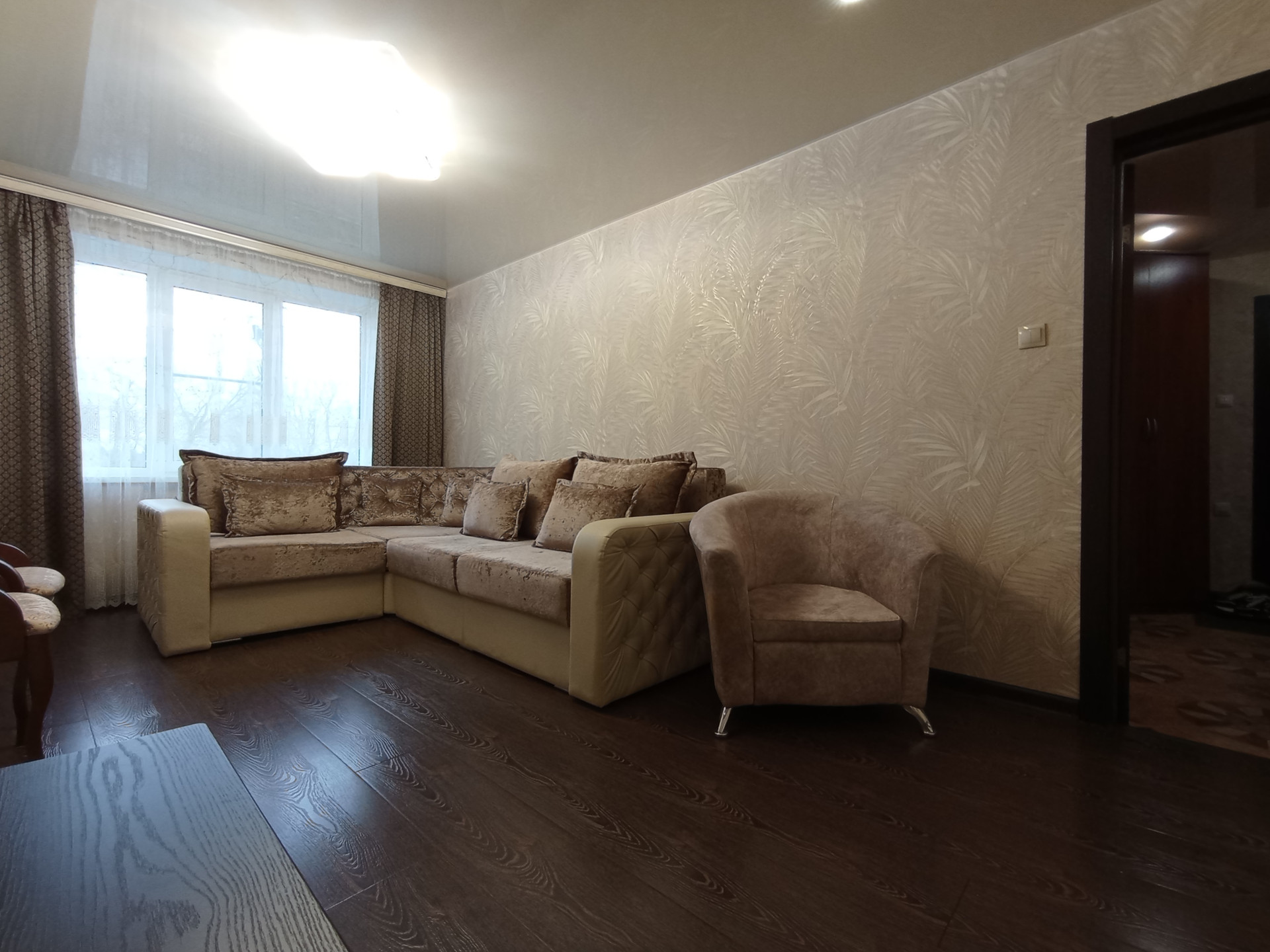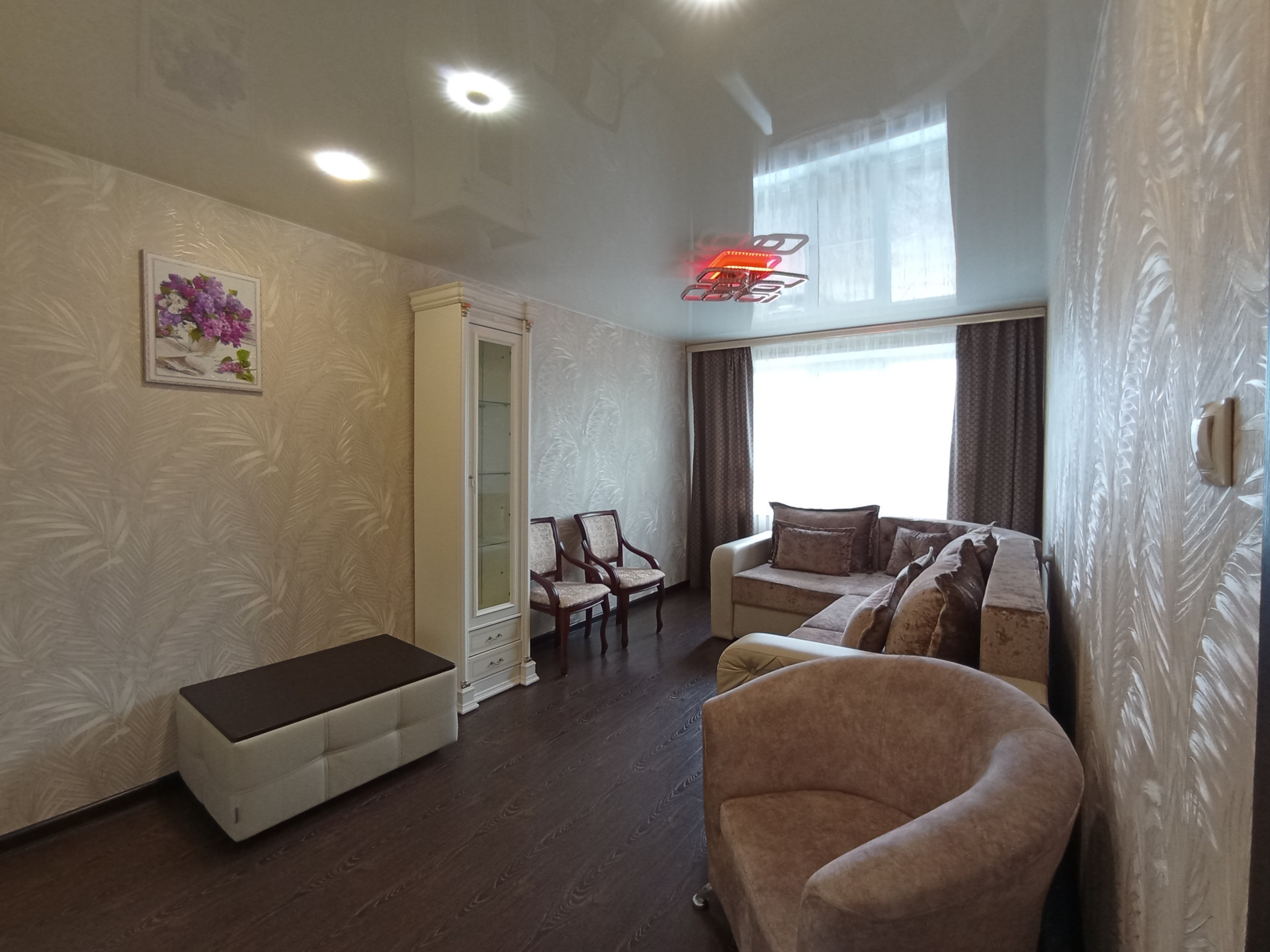 Ремонт свежий, современный, в квартире идеально чисто и эстетично, можно сразу въезжать без дополнительных затрат и хлопот. На кухне и в зале подвесные потолки, в комнатах - натяжные с встроенными светильниками. Пол во вспомогательных помещениях (прихожая, санузел, кухня)-керамическая плитка, в комнатах-ламинат. Входная дверь металлическая повышенной прочности и надёжности, антивандальная. Цокольный этаж высокий. В подъездах косметический ремонт, чисто, асоциальных элементов нет.