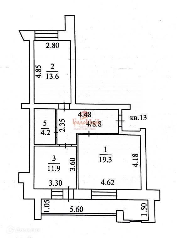 В квартире 2 просторных изолированных комнаты (19.3 кв.м; 13.6 кв.м).