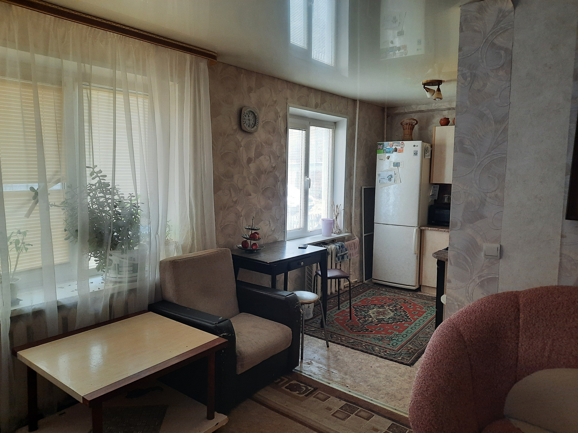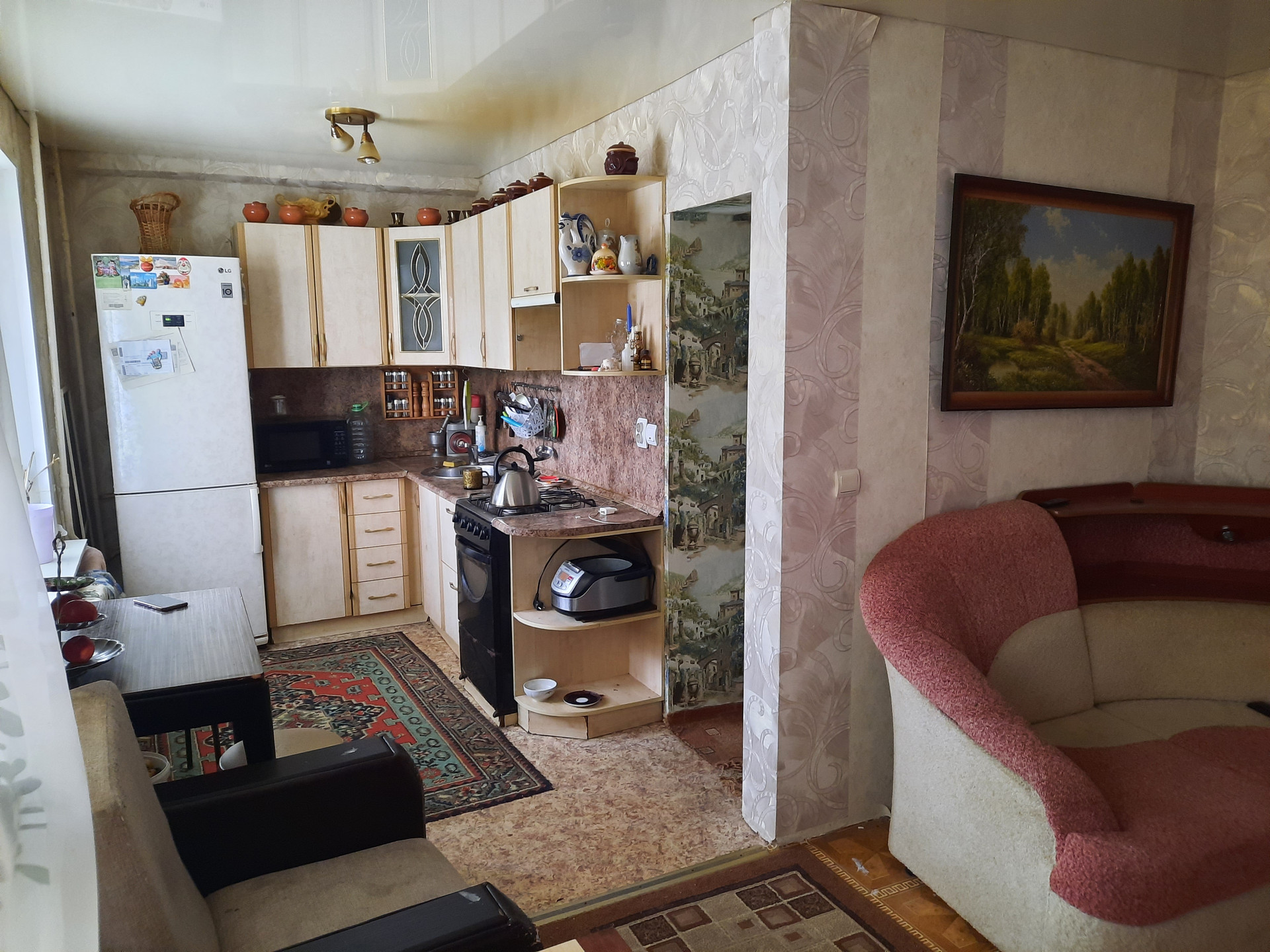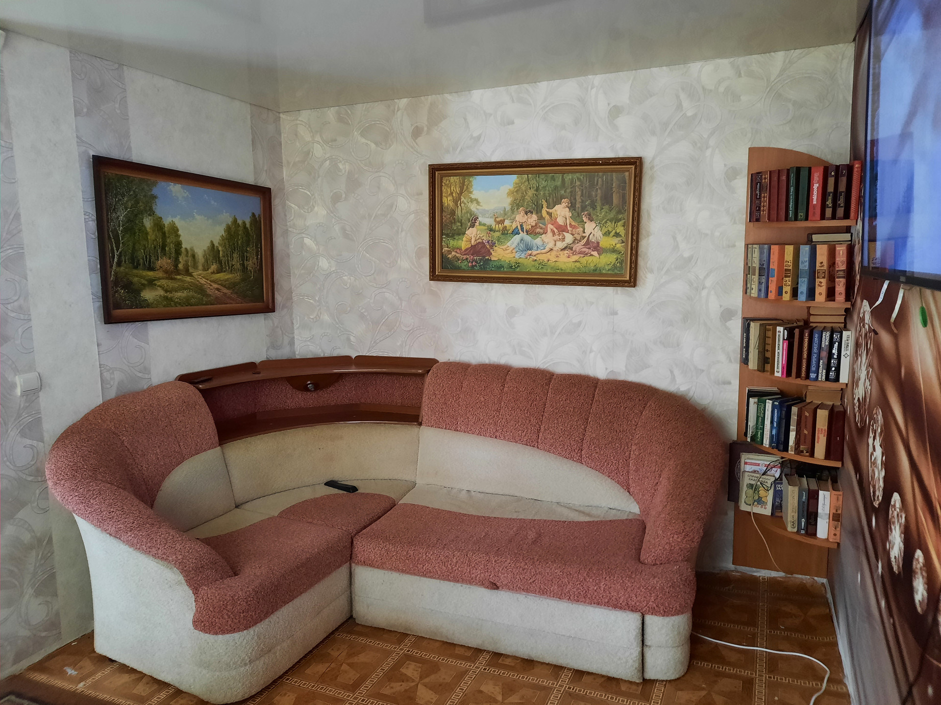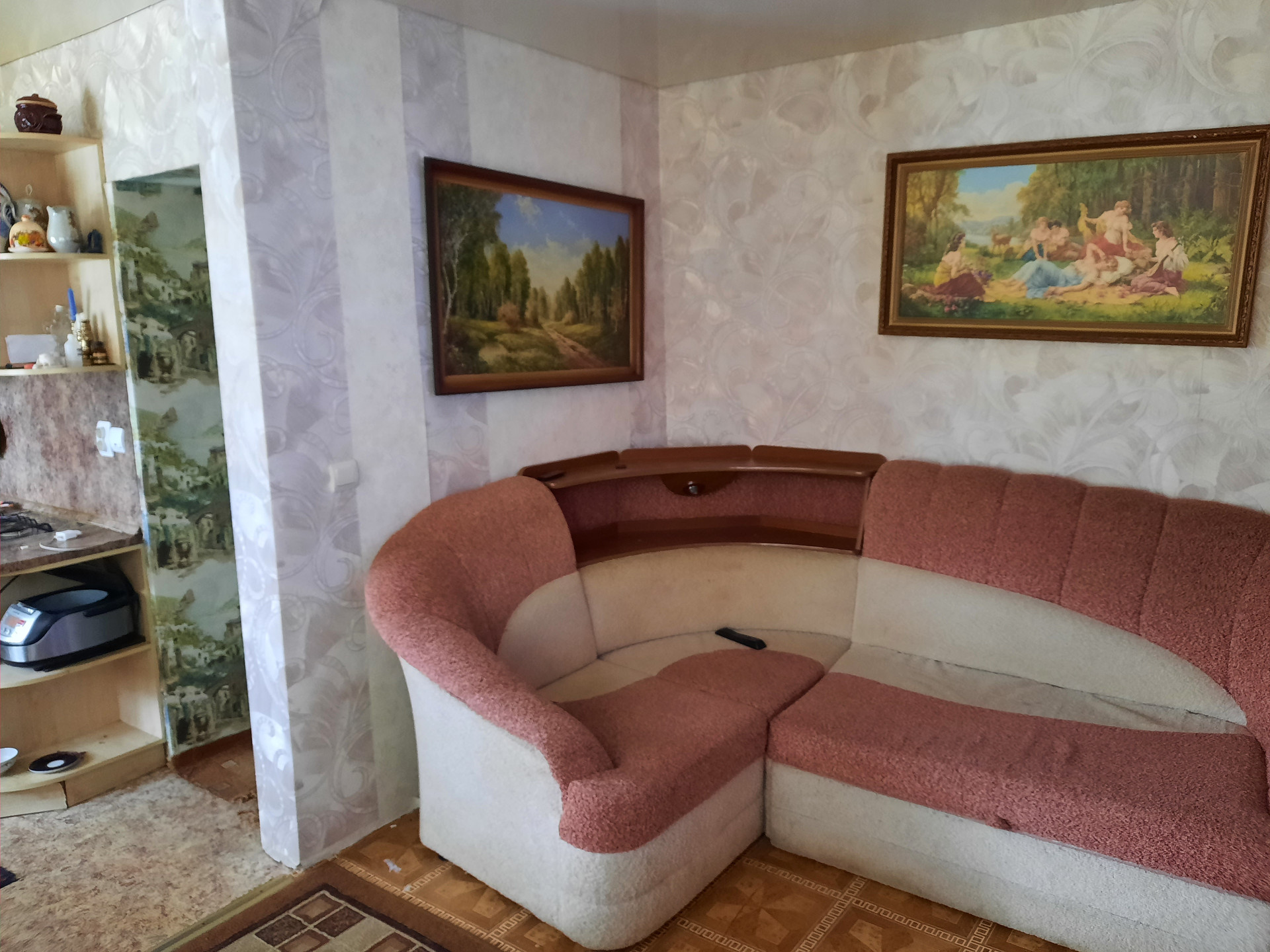Большая комната (зал) совмещена с кухней в результате чего образовалась светлая, тёплая, уютная гостиная. В этой комнате расположен большой угловой диван, телевизор, а также встроенная кухня.
