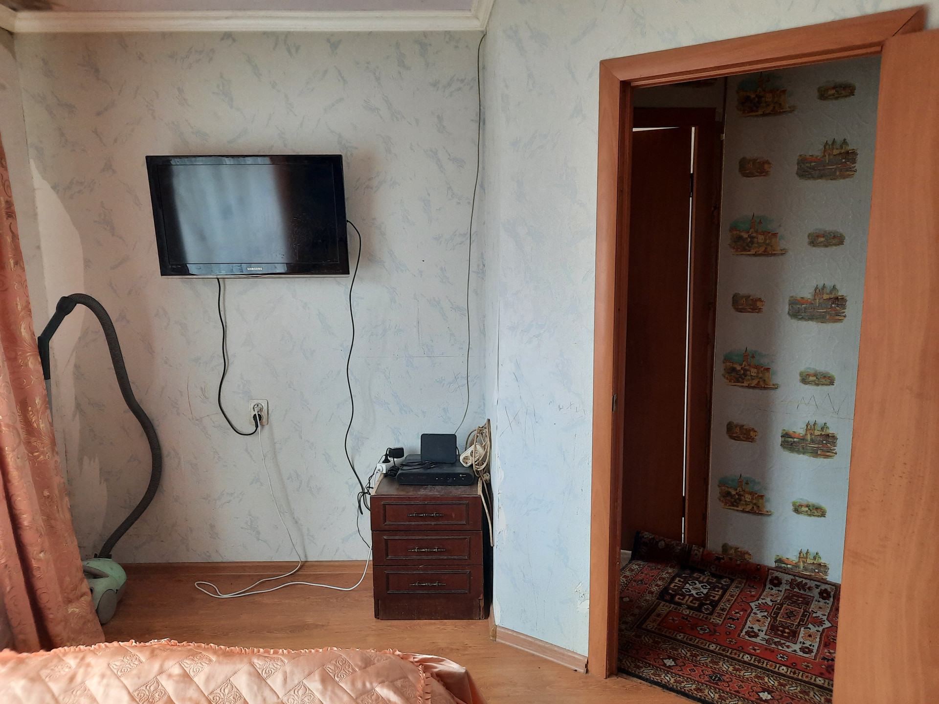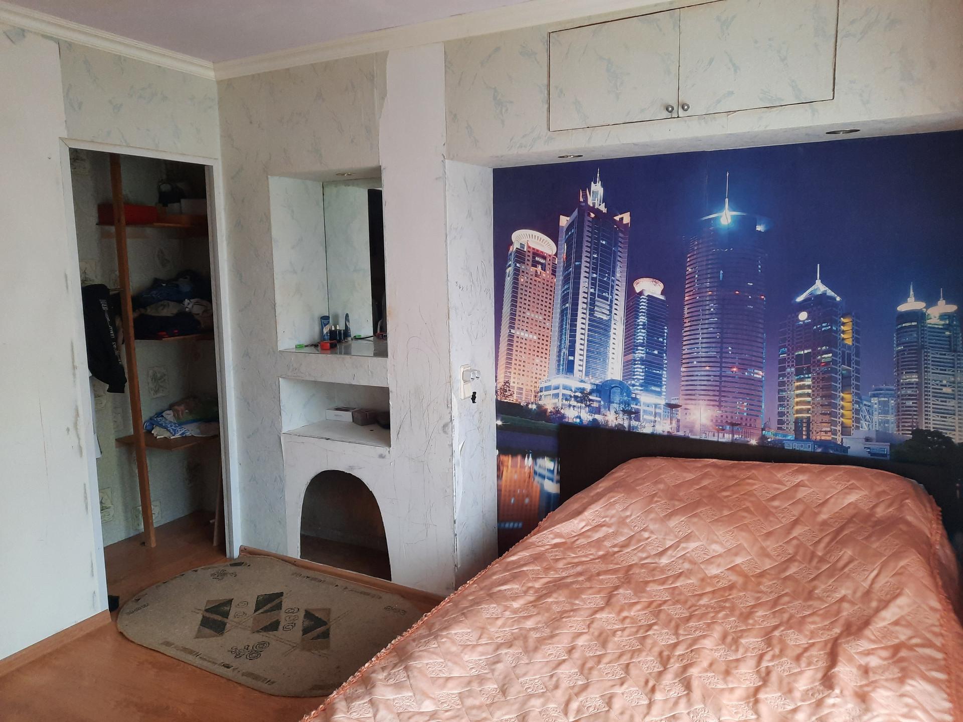 Спальная комната (для взрослых) оборудована двуспальной кроватью, встроенным шкафом, антресолью, зеркалом, а также телевизором. В этой комнате на полу уложен ламинат.