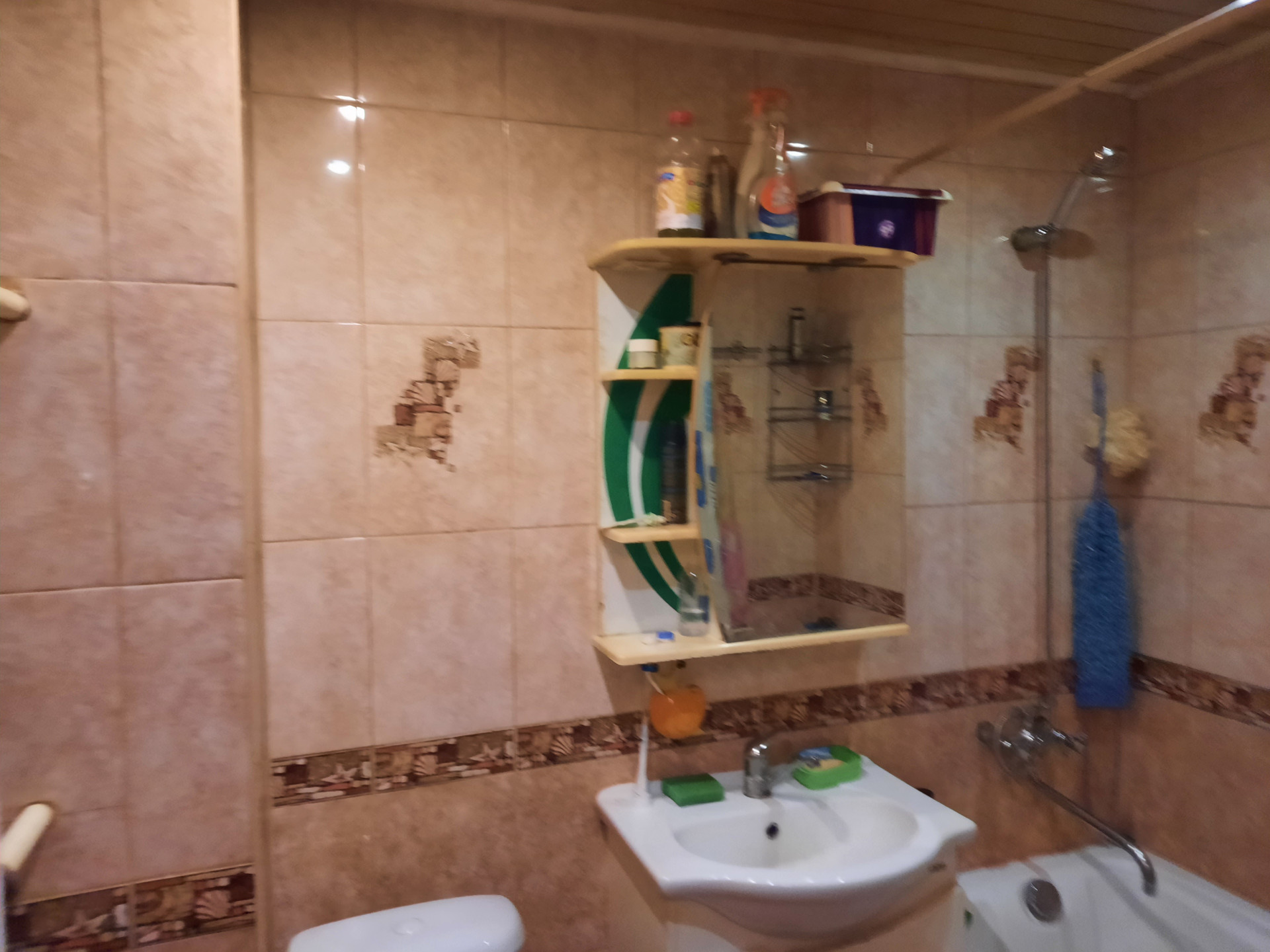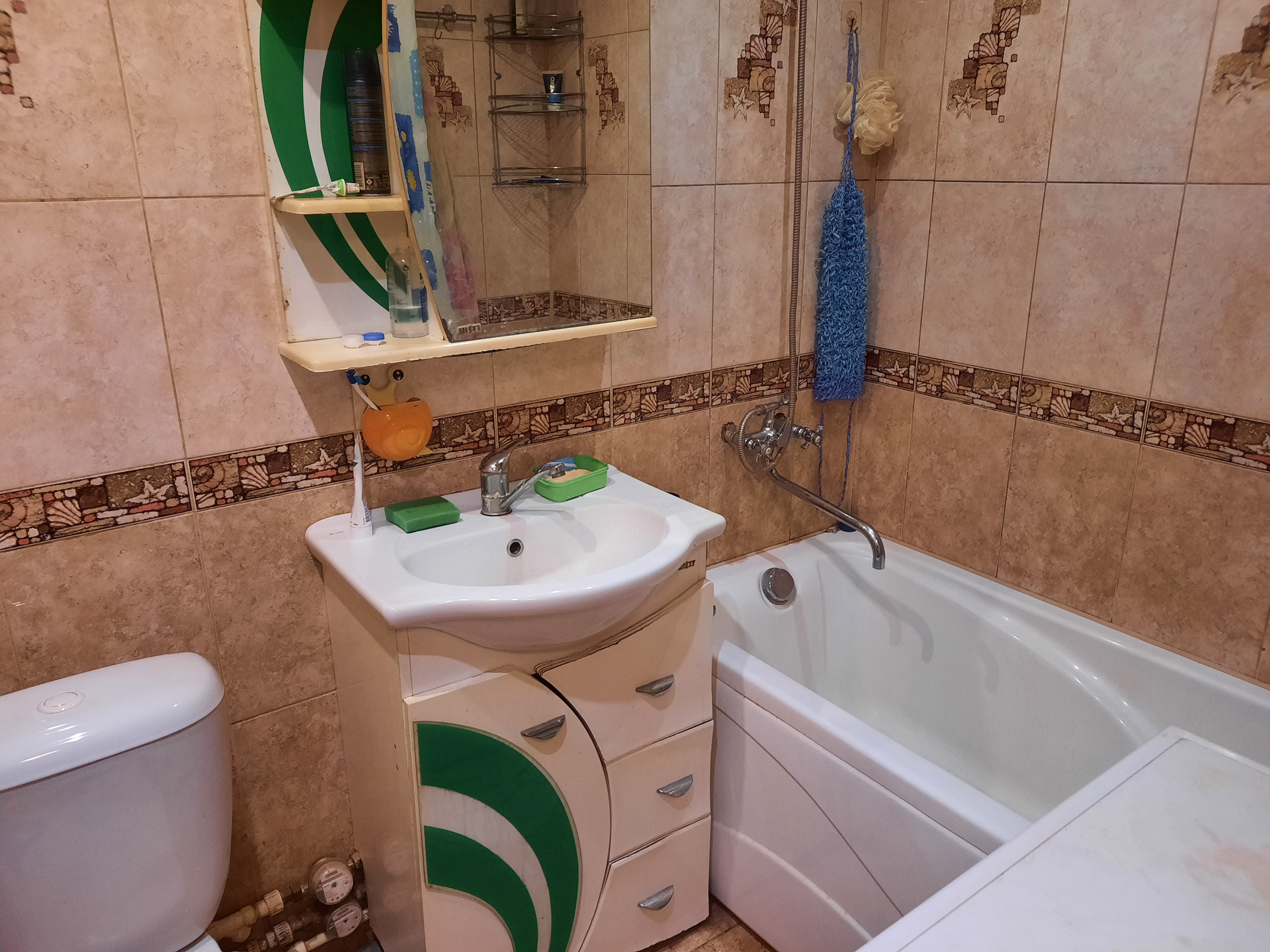 Ванная комната совмещена с санузлом, отделка произведена керамической плиткой тёплого тона, установлены приборы учёта холодного и горячего водоснабжения.