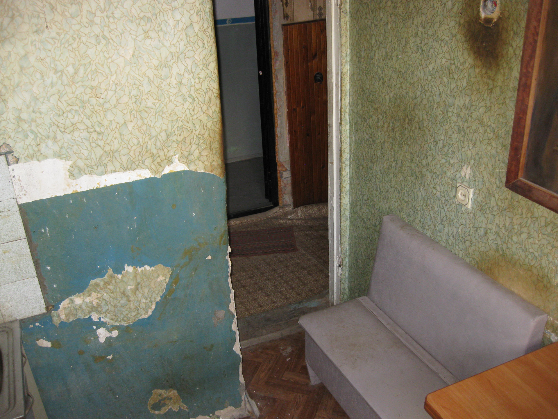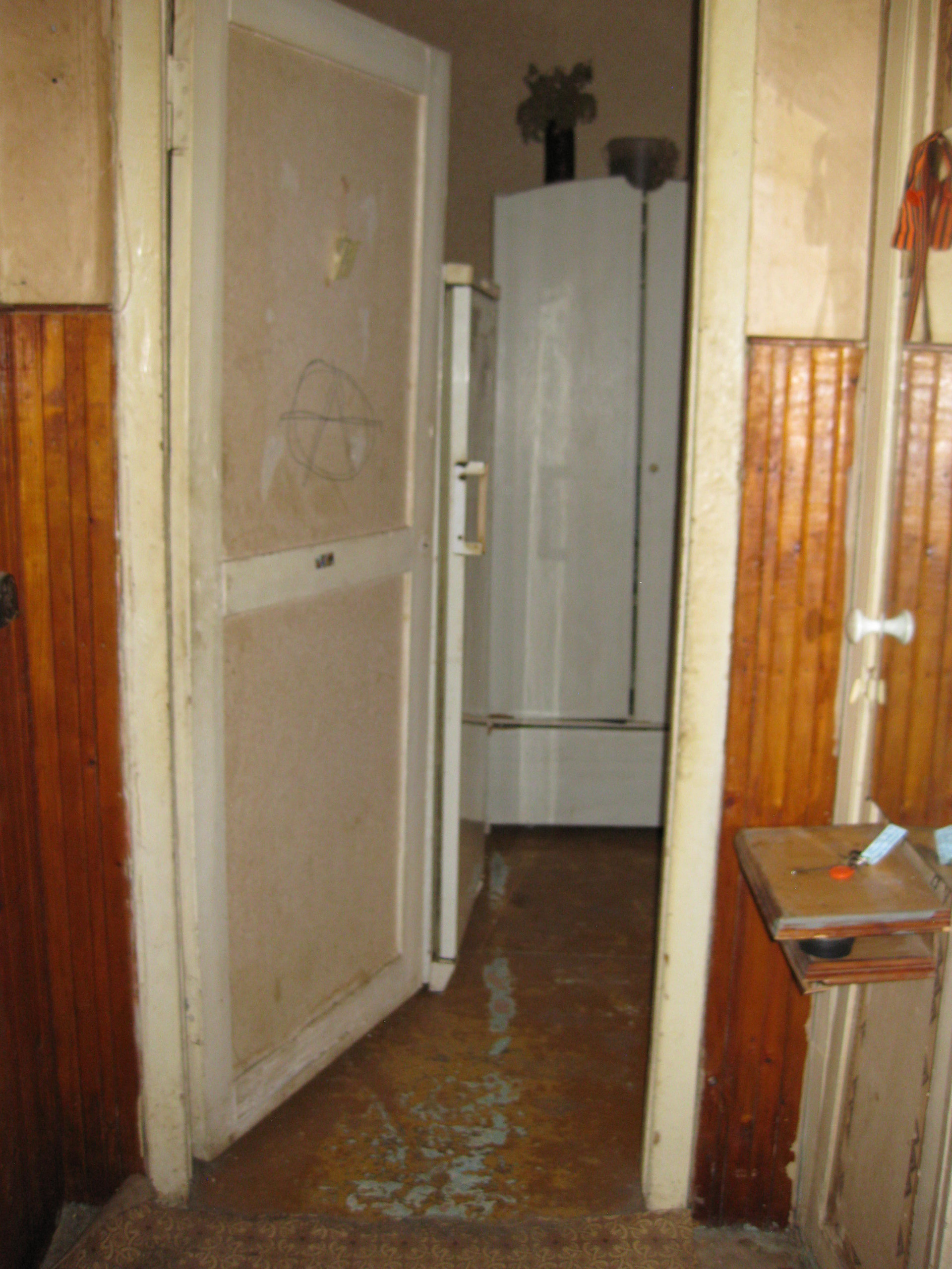 Металлическая дверь. Счётчики на электричество и воду. Заменены сантехнические трубы. Газовая плита 2-х конфорочная, старый холодильник, раковина на кухне, мойка, ванна, унитаз – всё в наличии. Деревянные окна. Для проживания имеется набор старой мебели. Состояние под ремонт или для неприхотливых жильцов.