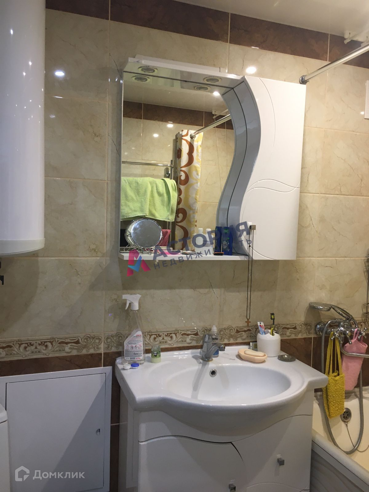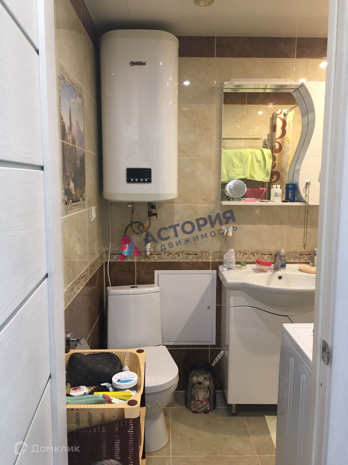 Санузел совмещенный, с красивой плиткой. Есть водонагреватель Термекс на 50л. Ванна советская, чугунная, отреставрирована акрилом, прослужит ещё долго. Встроенная кухня остаётся новым хозяевам.