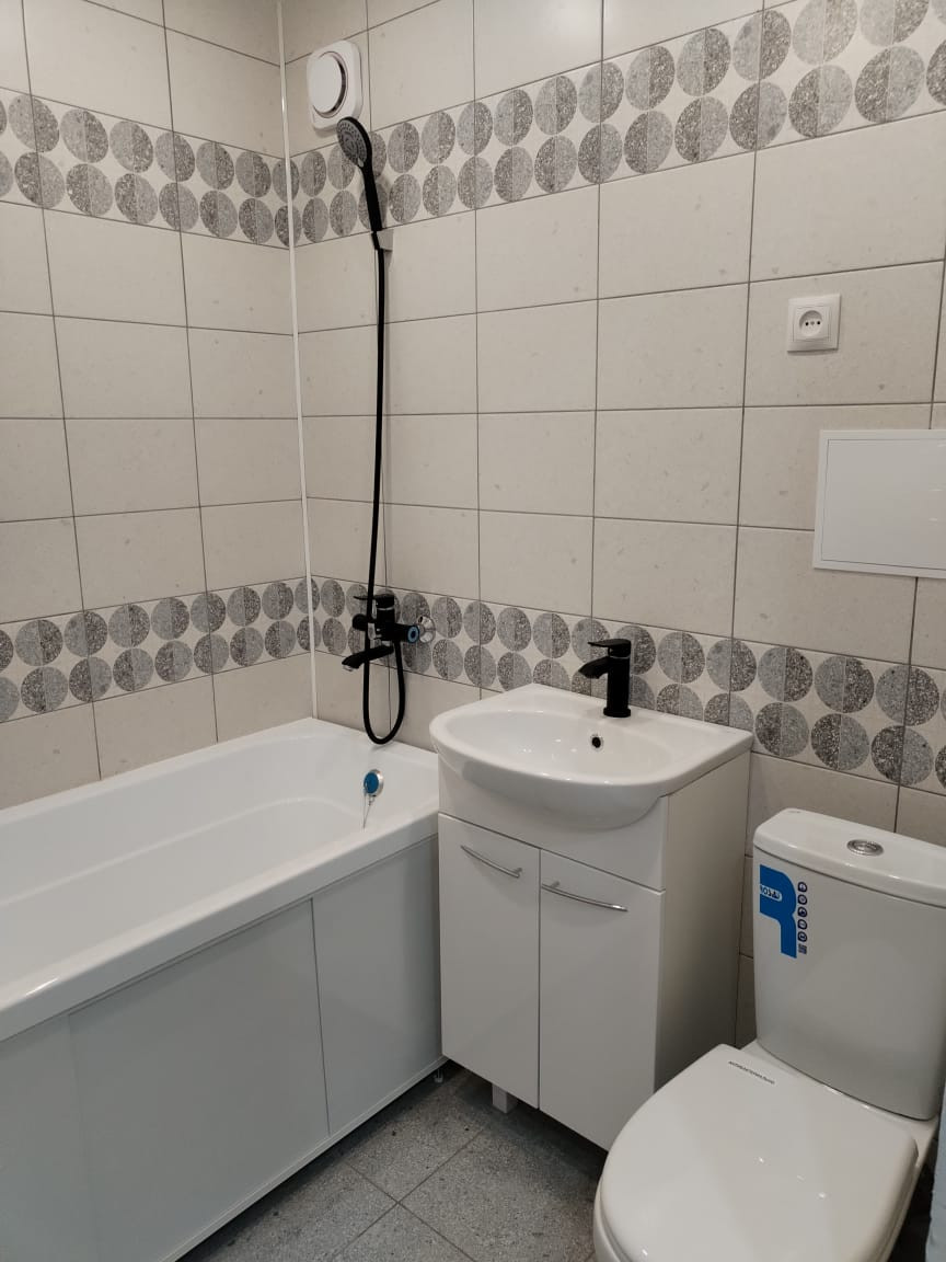 Санузел совмещен, стены и пол выполнены из керамической плитки, установлена новая ванная, раковина, компакт.