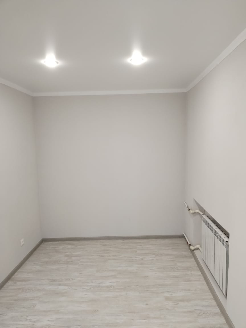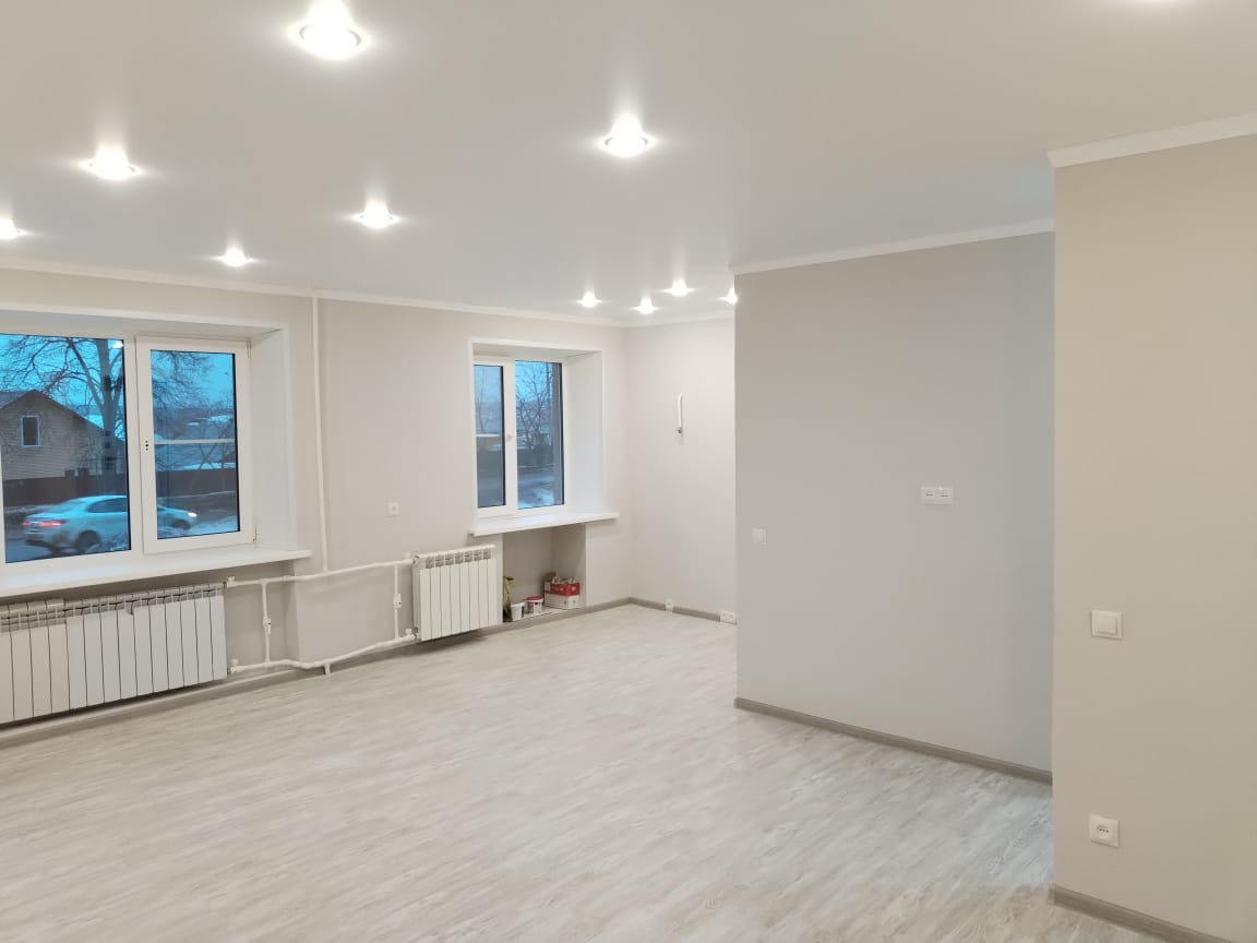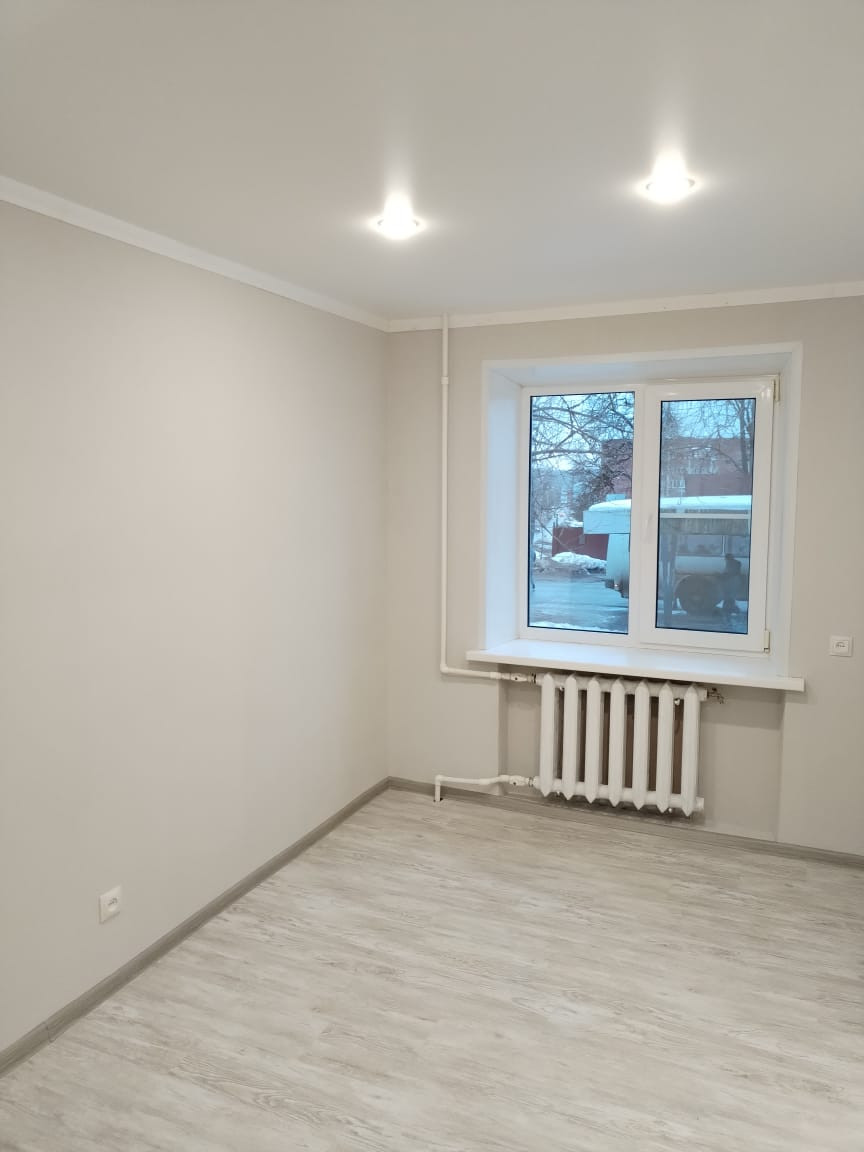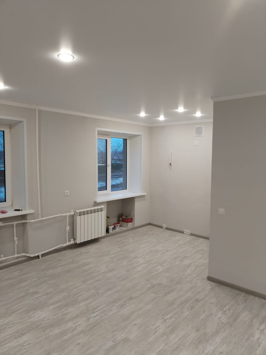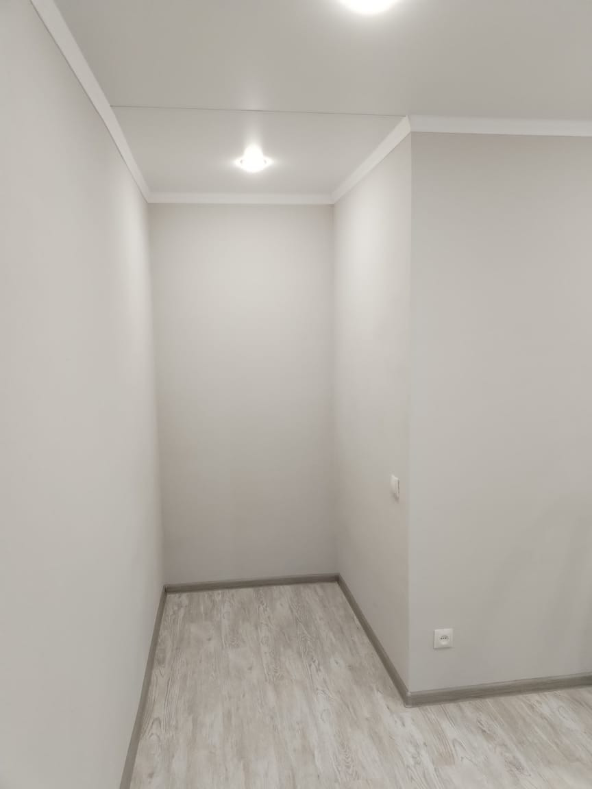 В квартире выполнен ремонт: выровнены и покрашены стены, заменена электрика, сантехника, установлены пластиковые стеклопакеты, на полу уложен ламинат, натяжные потолки с подсветкой, установлены новые межкомнатные двери .