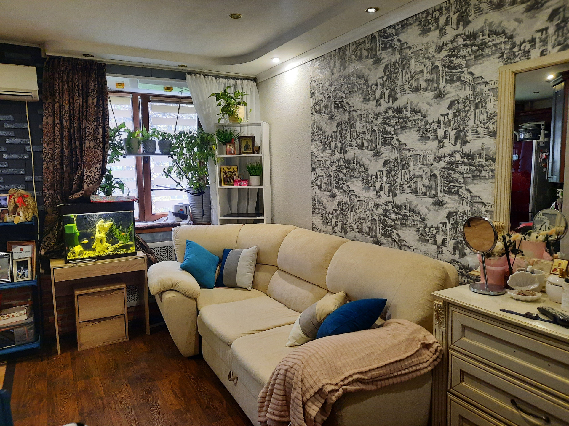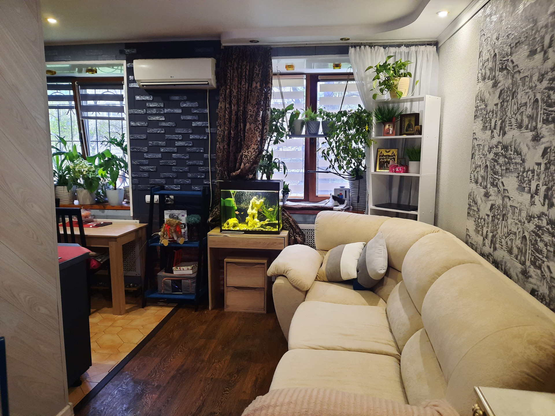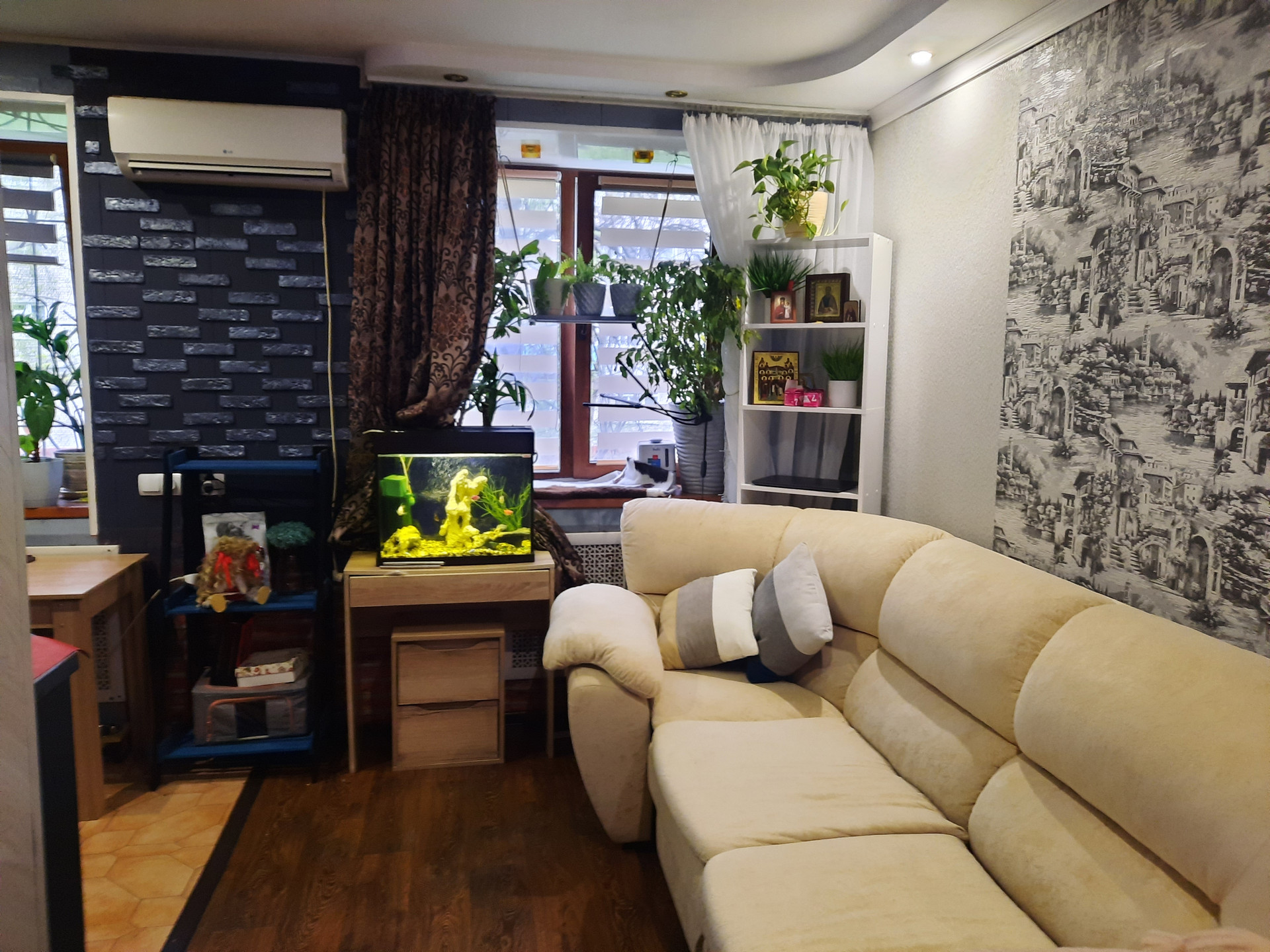 В гостиной комнате установлен КОНДИЦИОНЕР, удобный большой угловой диван, места для отдыха, камин, аквариум, телевизор, шкаф-купе и другая техника.