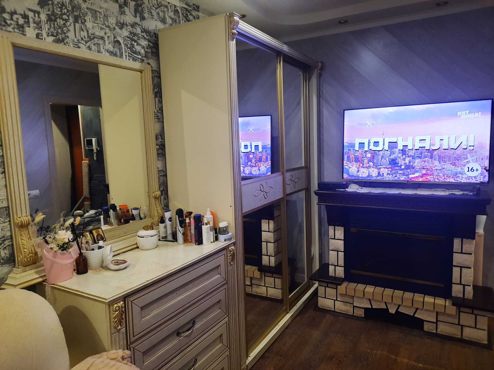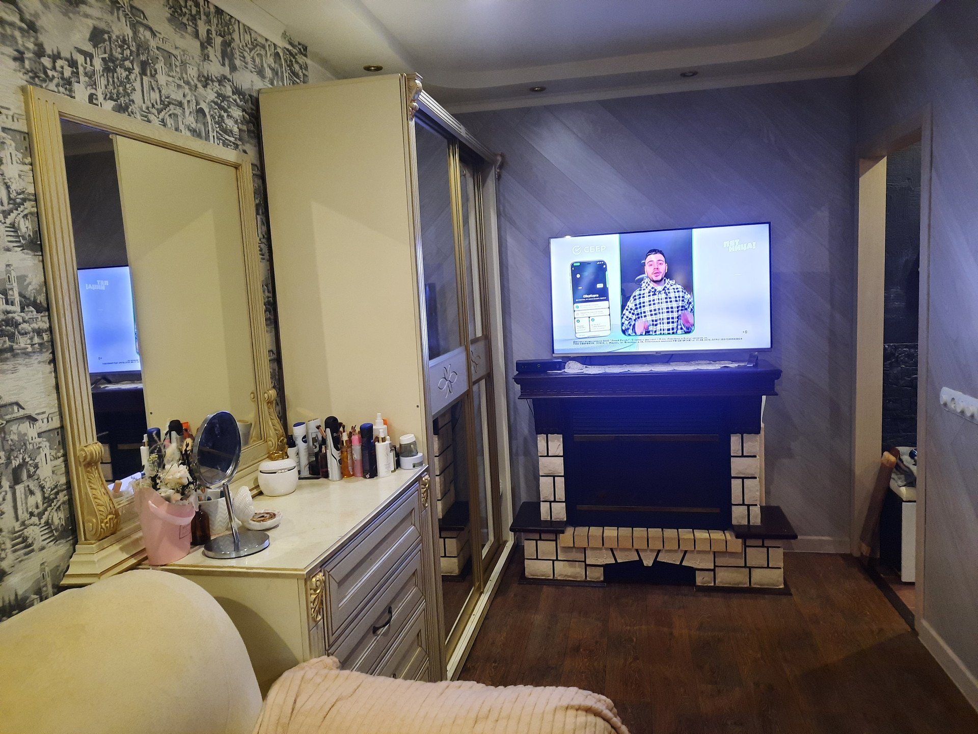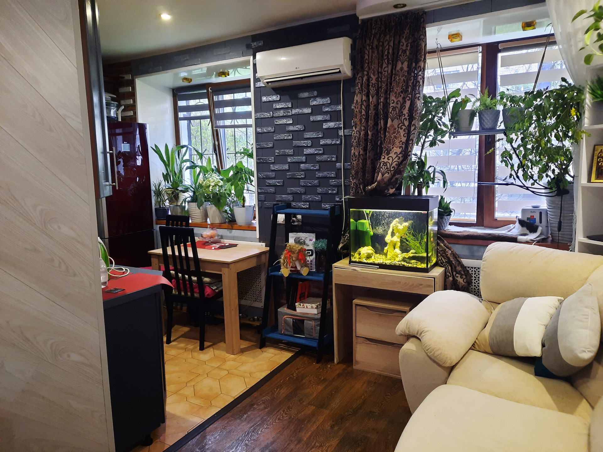 В гостиной комнате установлен КОНДИЦИОНЕР, удобный большой угловой диван, места для отдыха, камин, аквариум, телевизор, шкаф-купе и другая техника.