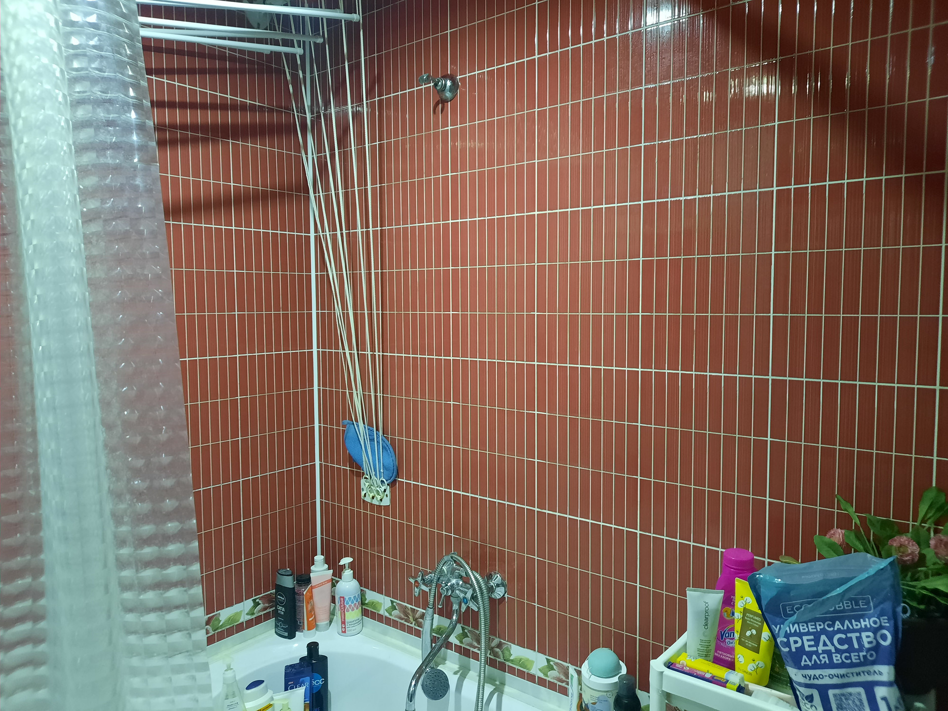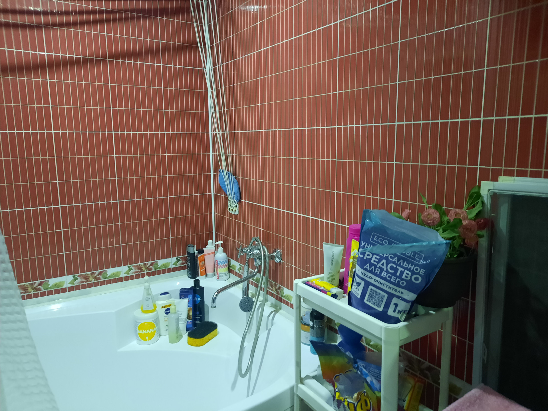 В огромной ванной комнате (7,5 кв.м.) установлены компакт, стиральная машина, подвесы для сушки белья, а также большая угловая акриловая ванна.