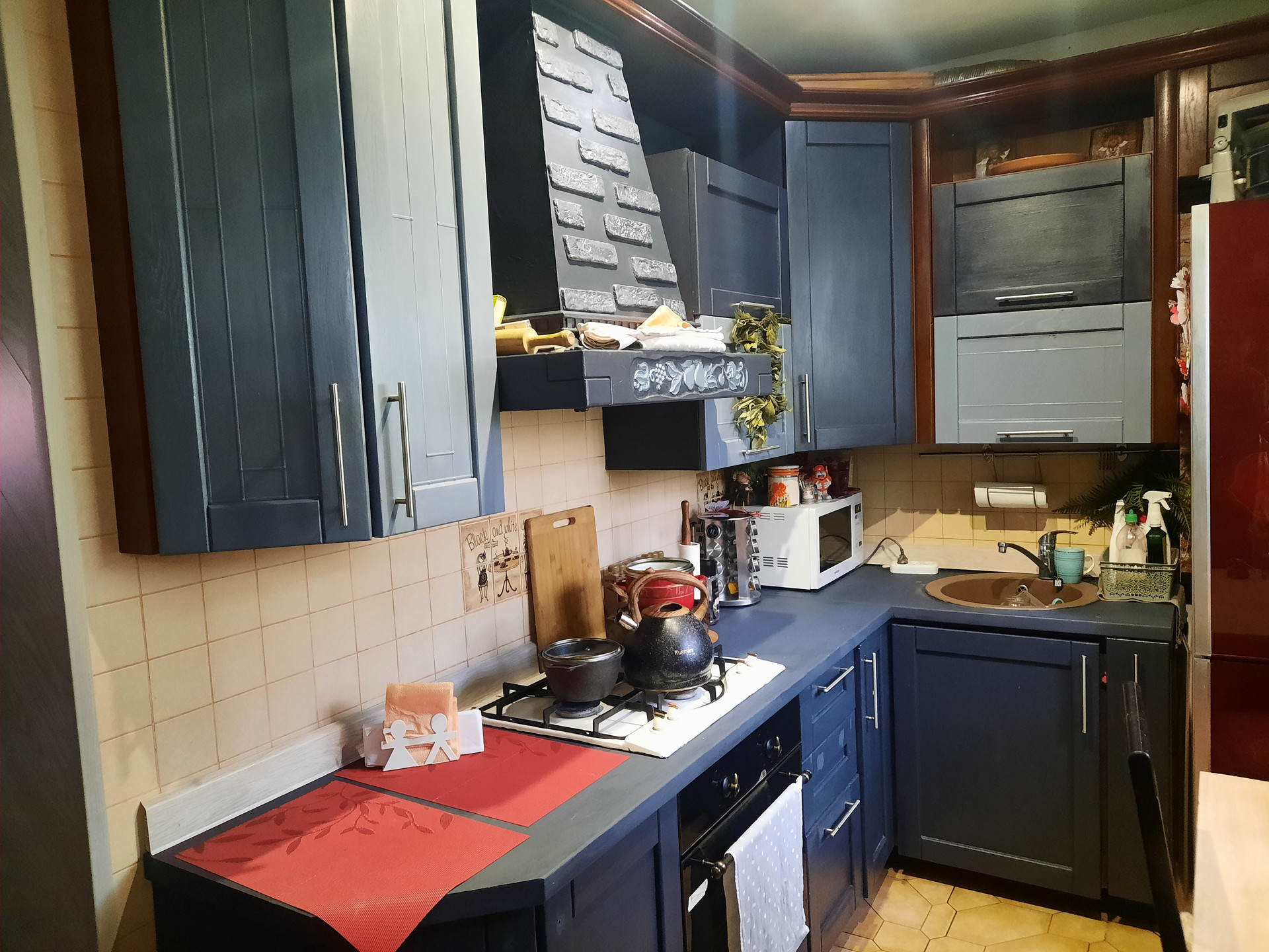Большая комната (зал) совмещена с кухней в результате чего образовалась большая, светлая, тёплая, уютная гостиная.