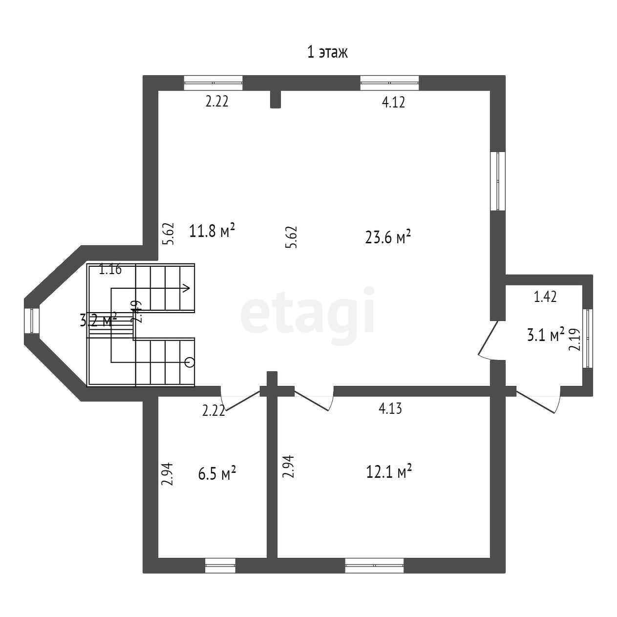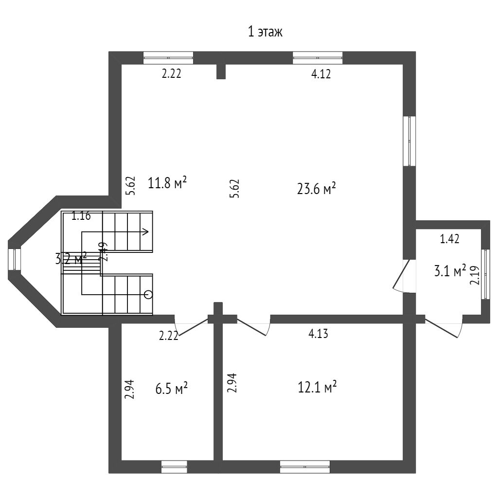 Первый этаж: просторная гостиная с кухней, санузел и 2 комнаты.