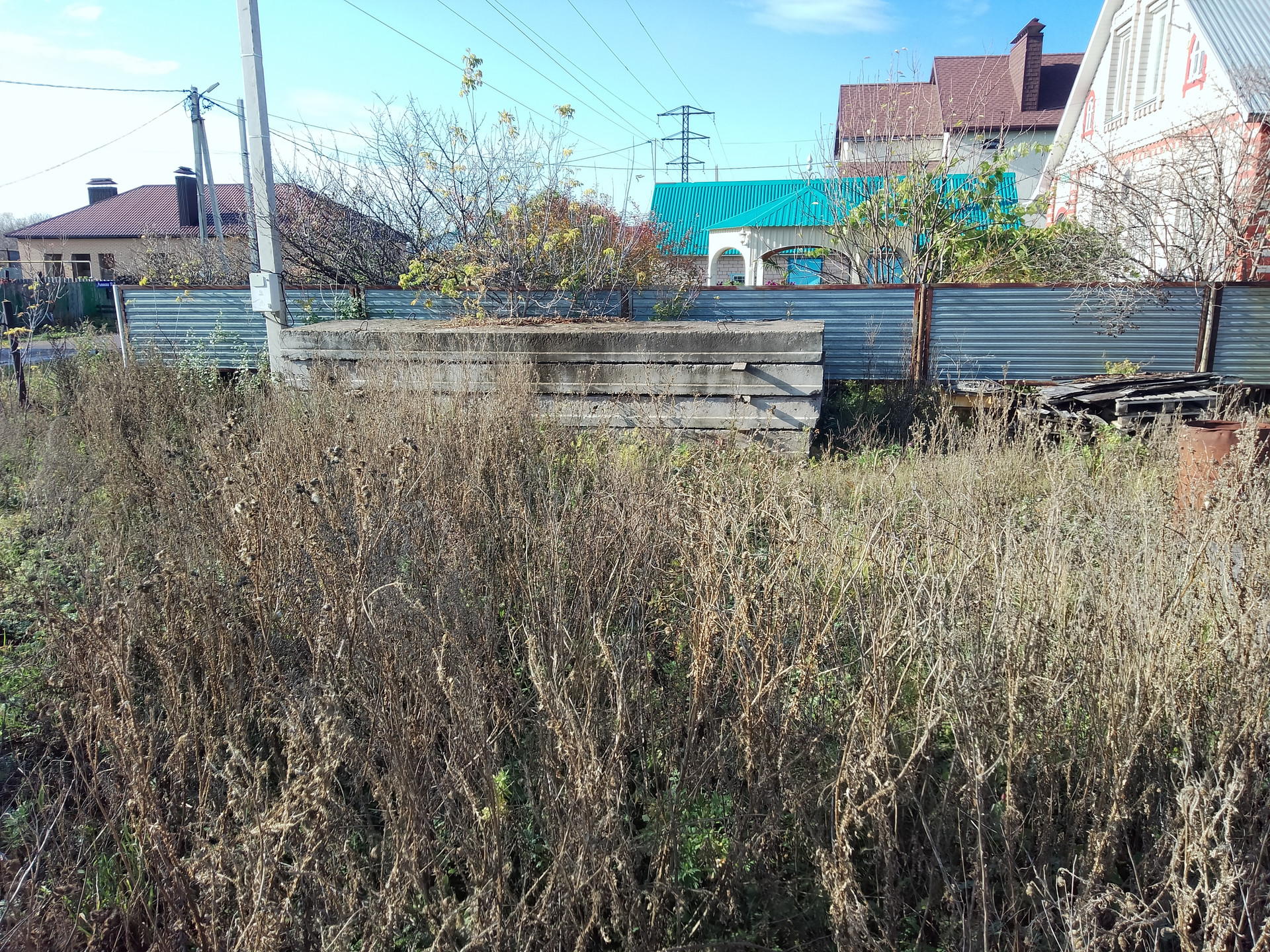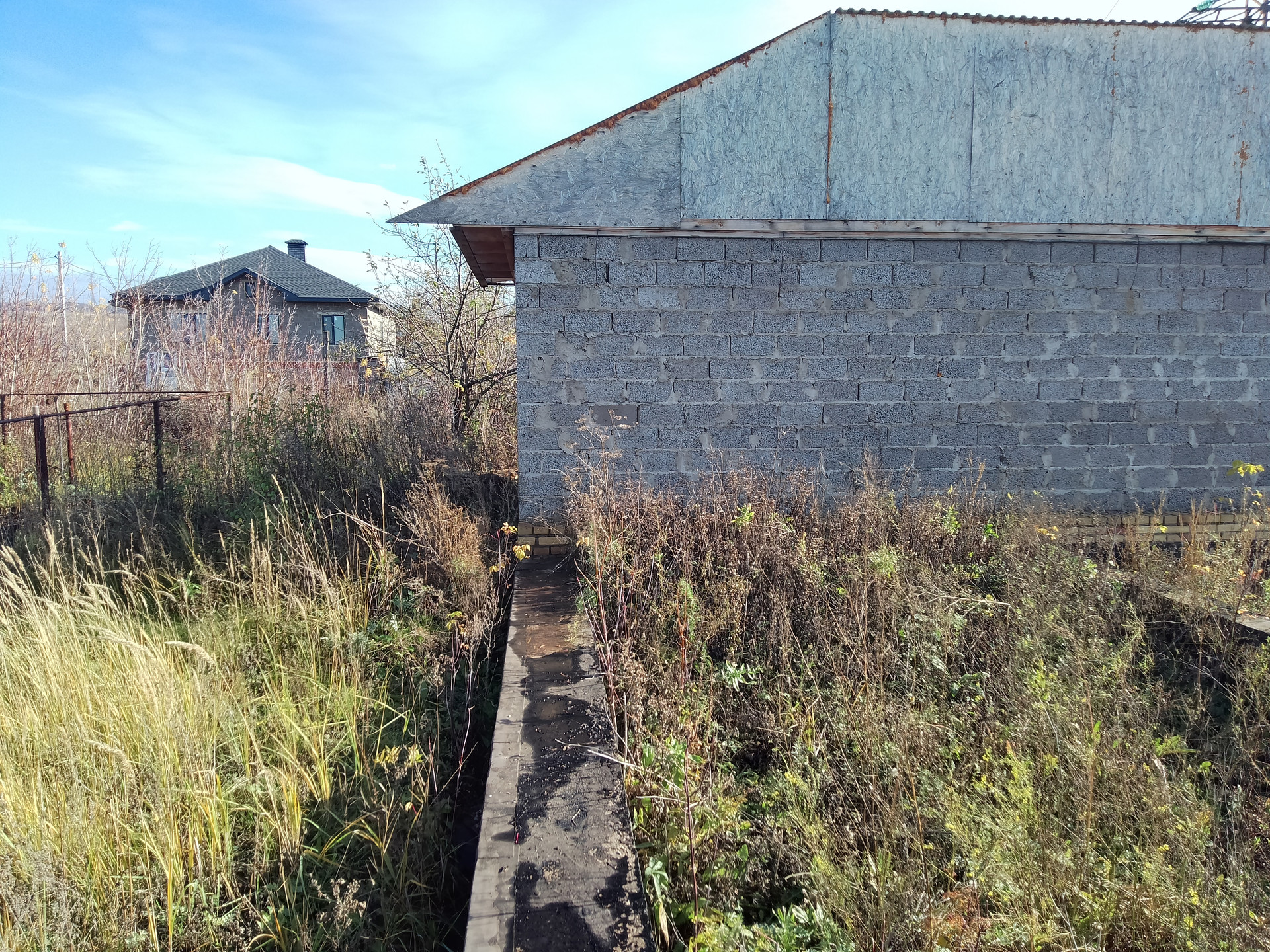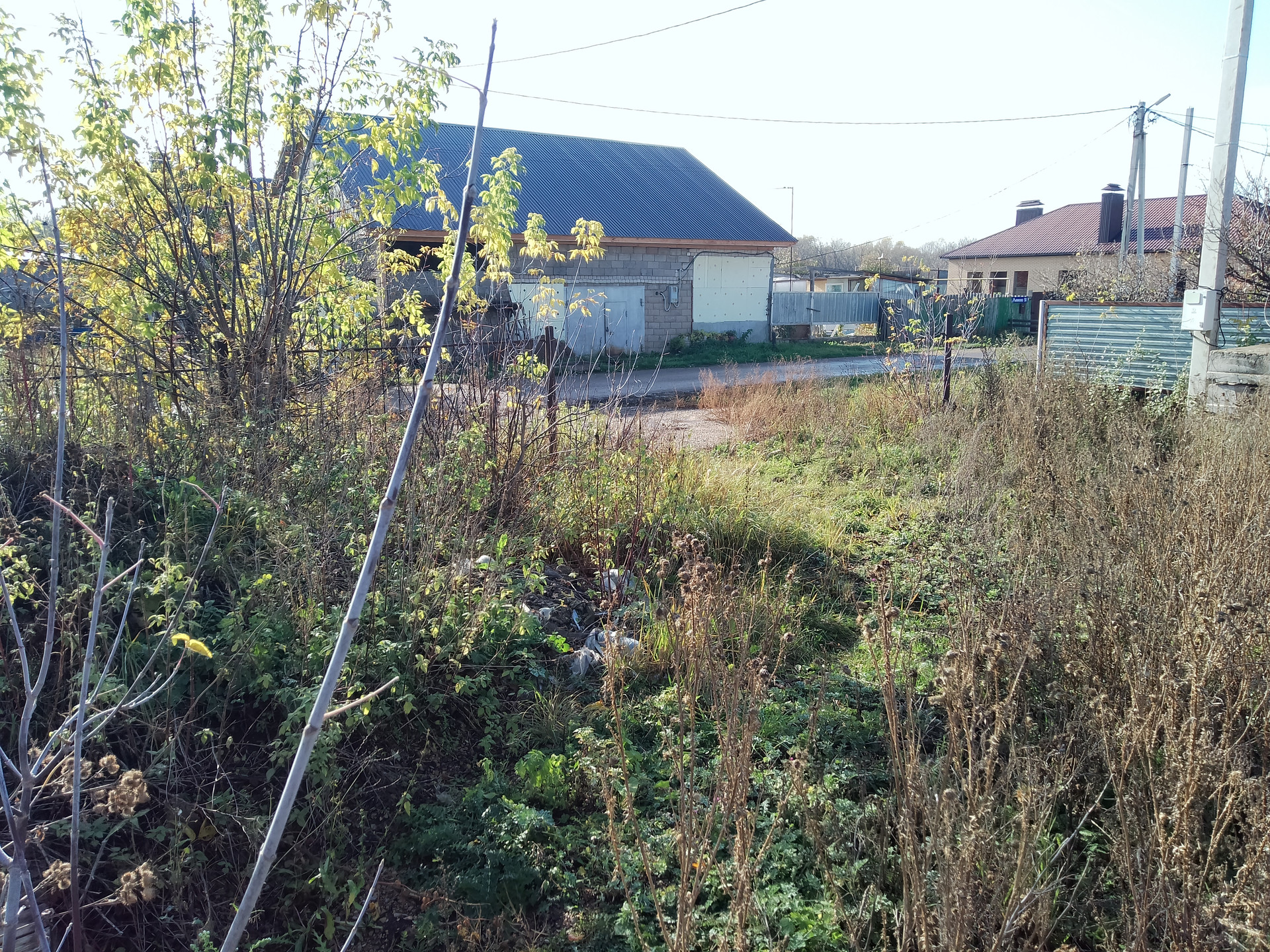 Хороший участок, есть фундамент и часть здания построены с крышей. Дорога асфальтированная, в шаговой доступности магазины, аптека, детский садик