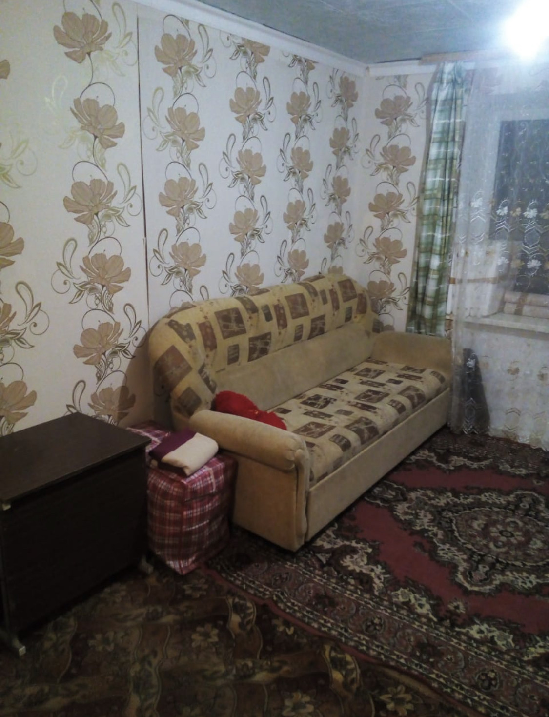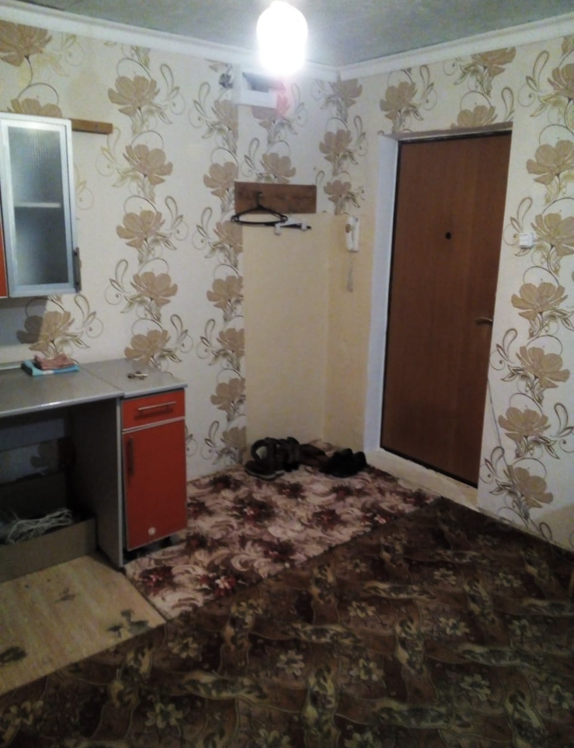 Комната большая с водой  и кухонным гарнитуром. Окно и входная дверь заменены. Долгов нет.