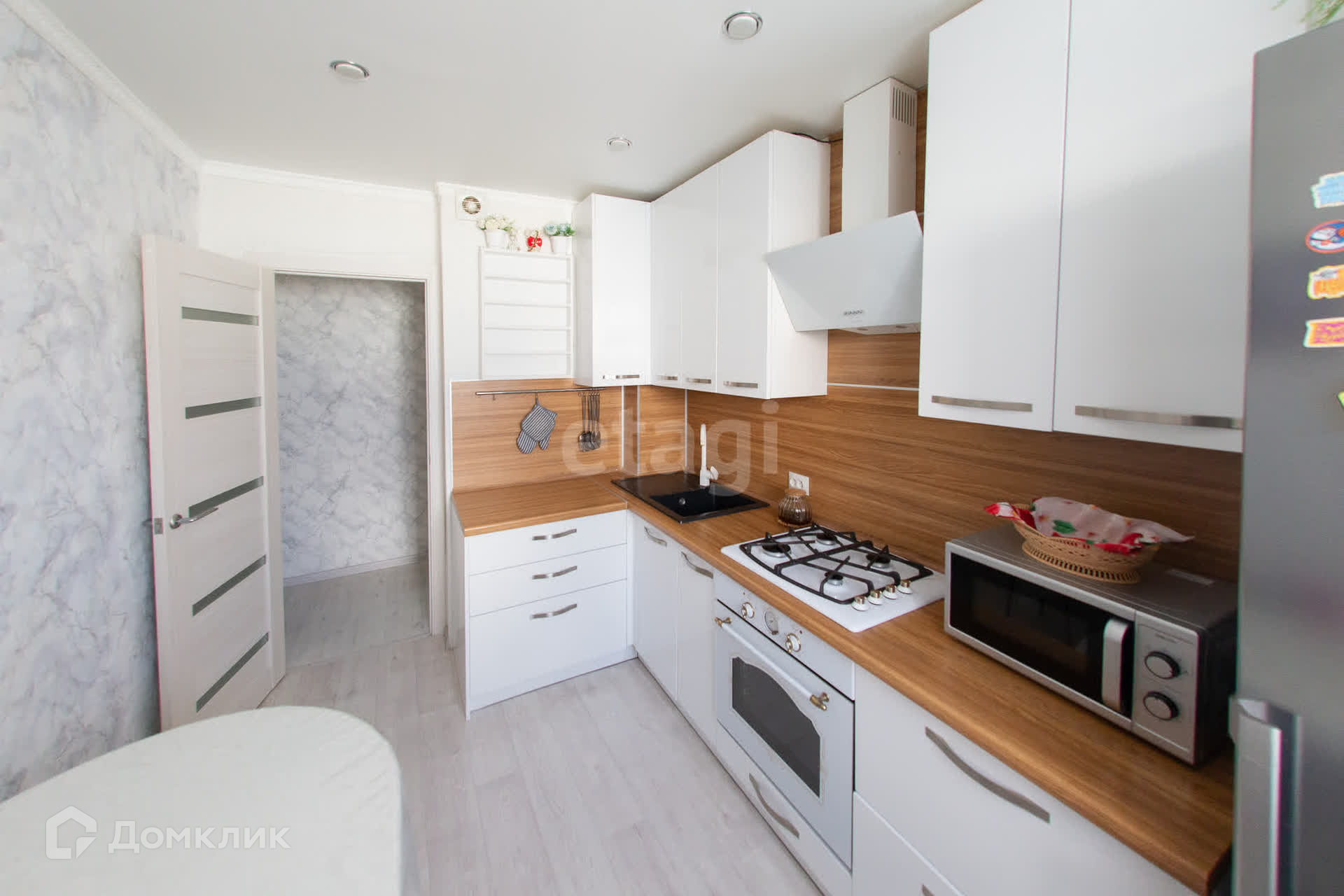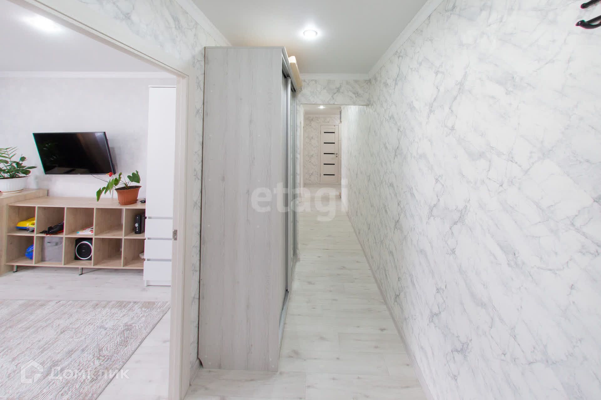 В квартире остаётся новая мебель: в зале - шкаф и тумба, в спальне - угловой шкаф, на кухне - кухонный гарнитур со встроенной техникой, в коридоре - шкаф-купе.